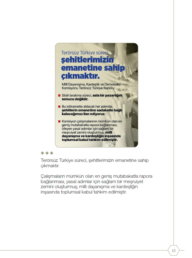 Millî Dayanışma, Kardeşlik ve Demokrasi Komisyonu Terörsüz Türkiye Raporunda Türk-Kürt ilişkileri, tarihsel bir kader birliği olarak tanımlanmış ve çözüm "kardeşlik hukuku" kavramına dayandırılıyor.