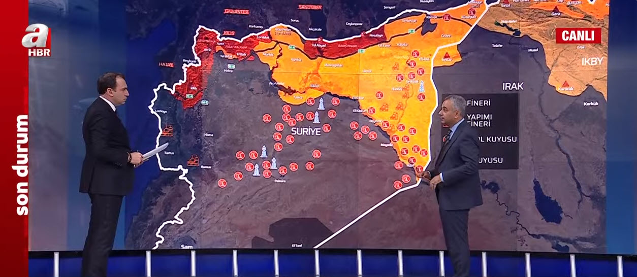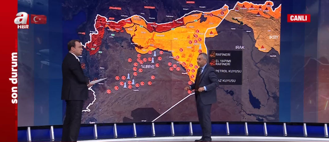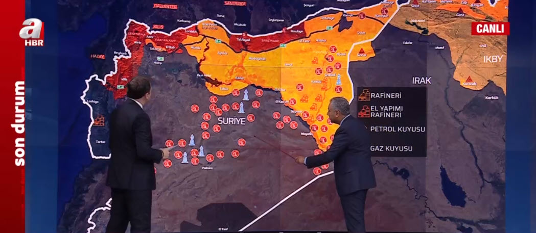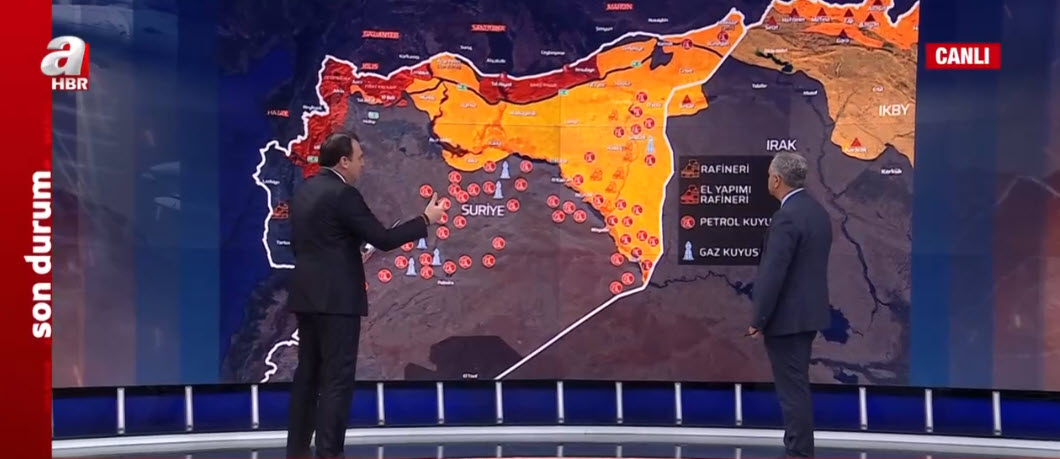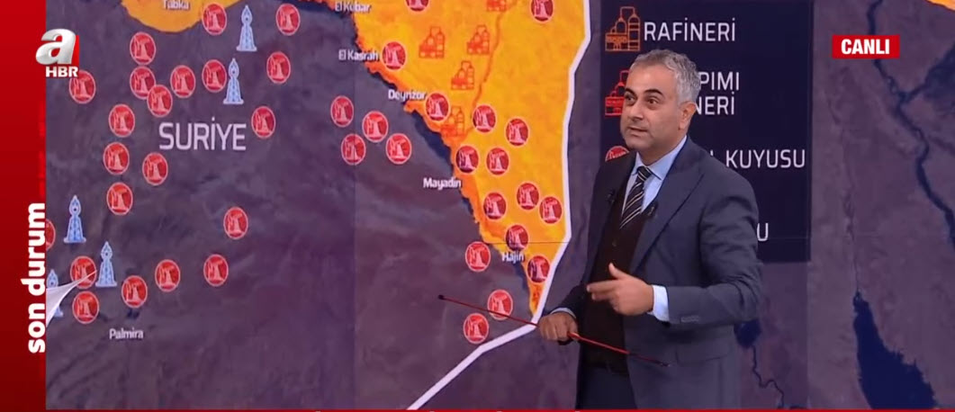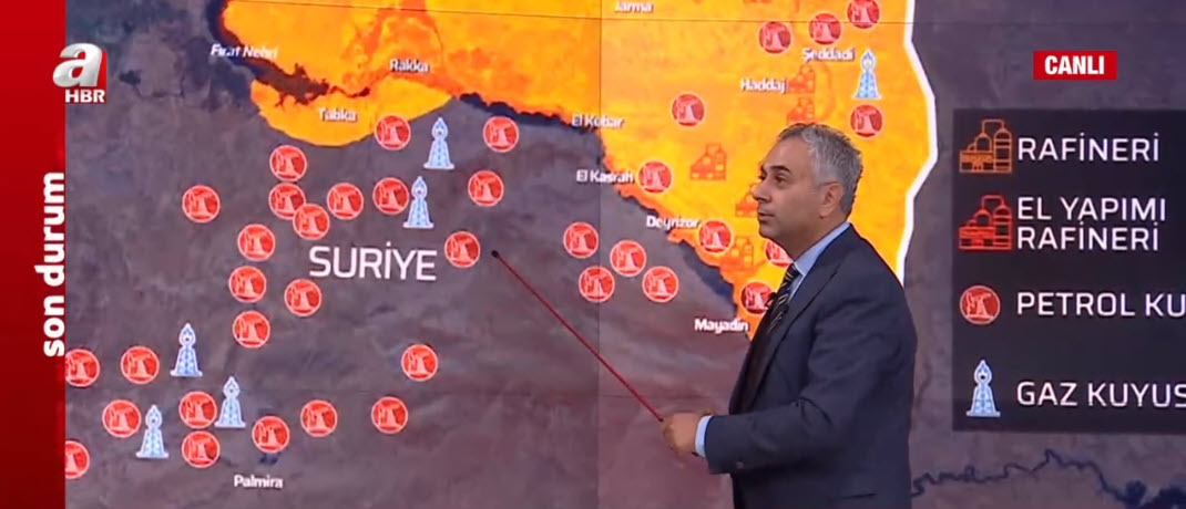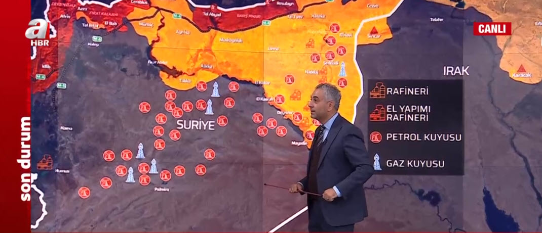 Suriye'de terör örgütünün kontrolündeki bölgelerde neler oluyor? PKK/YPG'nin hangi tesisleri vuruldu? Terör enerjisini nereden alıyor? PKK/PYD'nin kontrolündeki enerji-petrol tesisleri nerede? Terör örgütü PKK milyar dolarlık petrolü Suriye'de nasıl çalıyor? İstanbul Gelişim Üniversitesi Öğretim Üyesi Dr. Ali Semin, A Haber canlı yayınında harita üzerinde tek tek anlattı. Üretilen petrolün arkasında hangi ABD'li şirketin olduğunu açıkladı. Öte yandan A Haber PKK'nın işgal ettiği petrol kuyularını görüntüledi. Canlı yayında terör hedefleri böyle vuruldu.