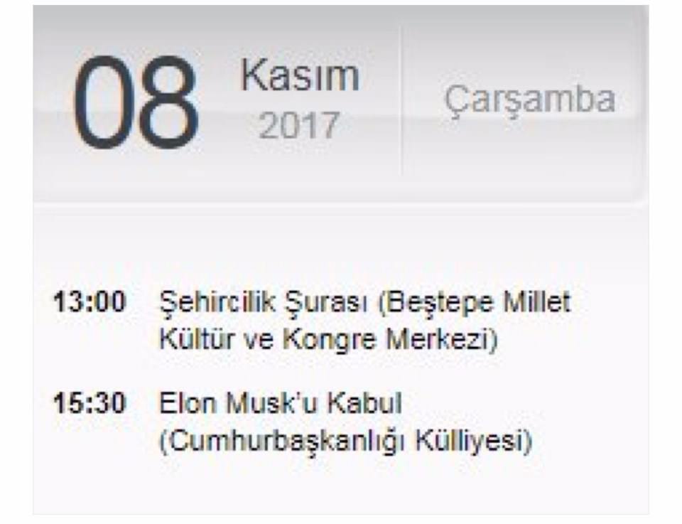 Cumhurbaşkanı Erdoğan, Musk ile bugün 15:30'da görüşecek. Görüşme Cumhurbaşkanlığı takviminde de görülüyor.