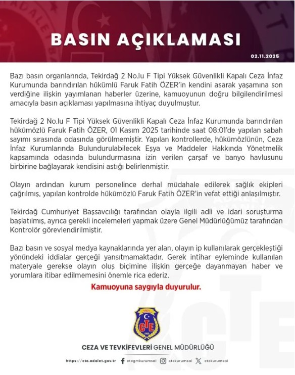Tekirdağ Cumhuriyet Başsavcılığı olayla ilgili soruşturma başlattı. Edinilen bilgiye göre; Faruk Fatih Özer en az 1 en fazla 3 kişinin kaldığı cezaevindeki koğuşunda tek kalıyordu.