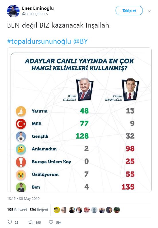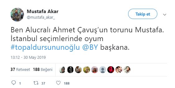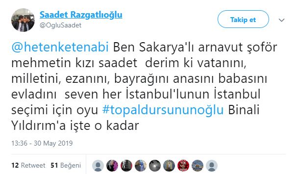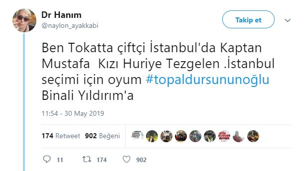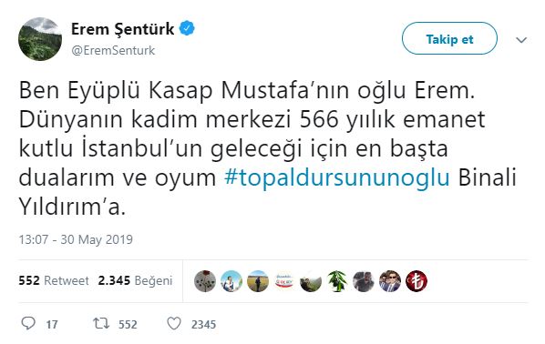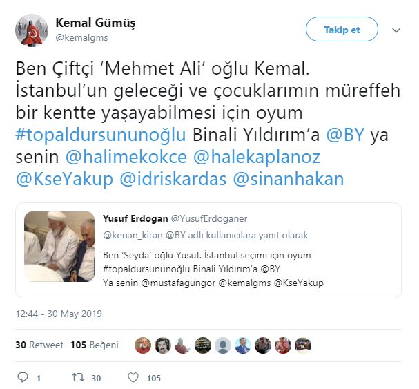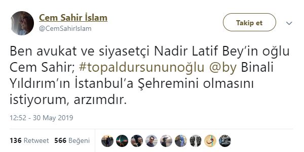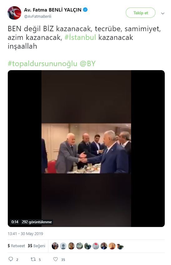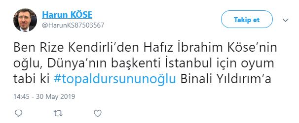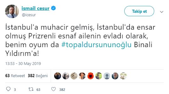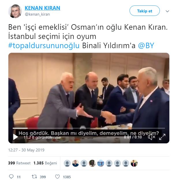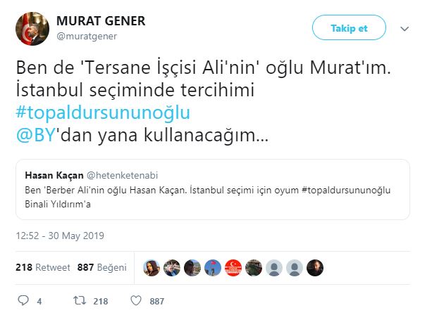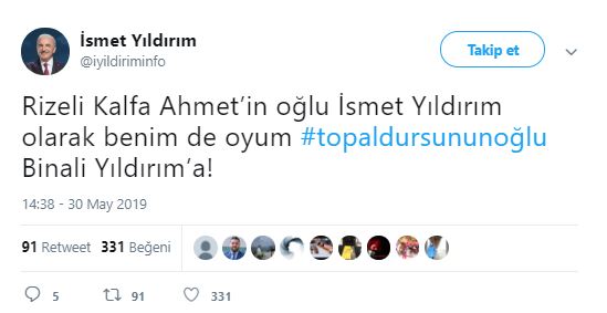 Cumhur İttifakı AK Parti İstanbul Büyükşehir Belediyesi Başkan Adayı Binali Yıldırım, Haliç Kongre Merkezi'nde, Doğu ve Güneydoğuluları ağırlamış. Ziyarete ilişkin sosyal paylaşım sitesi Twitter'daki şahsi hesabından; ''Topal Dursun'un oğlu Binali, Doğu ve Güneydoğulu hemşehrileriyle sahur yaptı. Benim için en yüce makam, gönlünüzdeki yerimdir'' ifadelerini kullanmıştı. Binali Yıldırım'ın, söz konusu ziyarette kendisine, "Başkan mı diyelim, demeyelim mi? Ne diyelim?" sorusuna, "Gönlünden ne geçiyorsa. Topal Dursun'un oğlu Binali de" şeklinde cevap verdi. Binali Yıldırım'ın mütevazılığını gösteren "Topal Dursun'un oğlu Binali" şeklindeki sözleri Twitter'da gündem oldu. Ünlüler de dahil olmak üzere Binali Yıldırım'a destek mesajı yağdı... İşte o mesajlar...