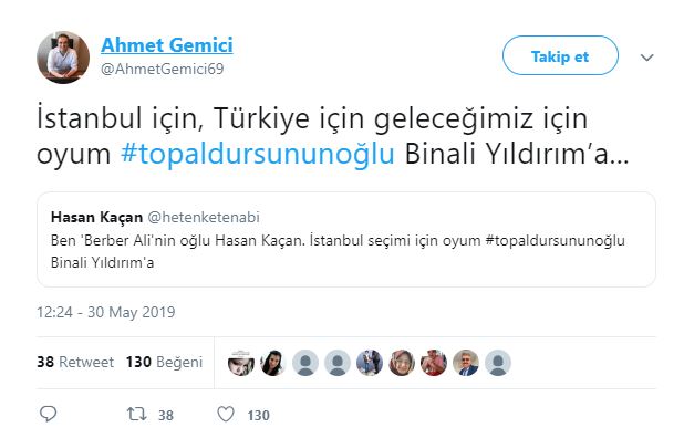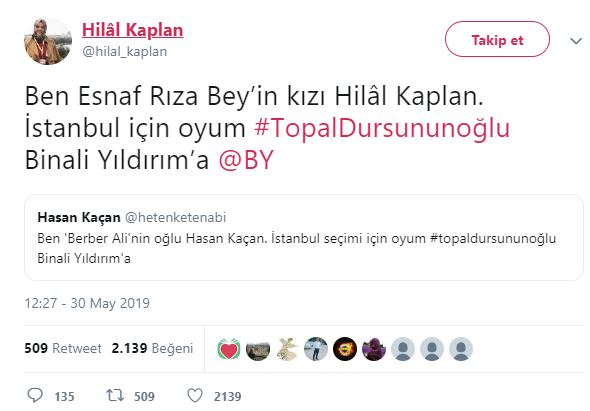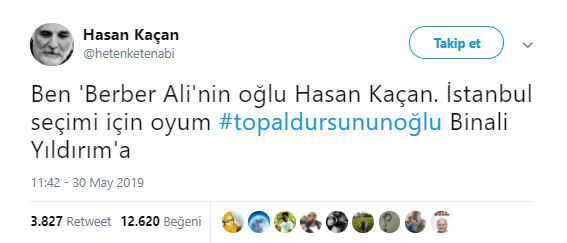 Ünlü karikatürist ve oyuncu Hasan Kaçan: "Ben 'Berber Ali'nin oğlu Hasan Kaçan. İstanbul seçimi için oyum #topaldursununoğlu Binali Yıldırım'a"