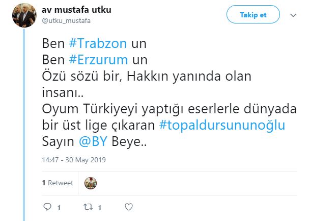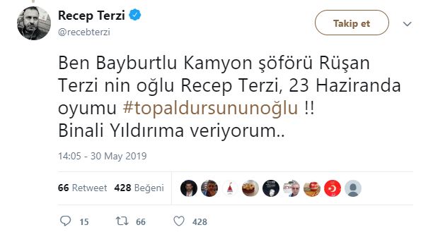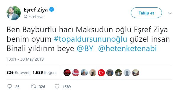Müzik Bir Meslek Birliği Başkanı ve sanatçı Eşref Ziya: "Ben Bayburtlu hacı Maksudun oğlu Eşref Ziya benim oyum #topaldursununoğlu güzel insan Binali yıldırım beye @BY @hetenketenabi