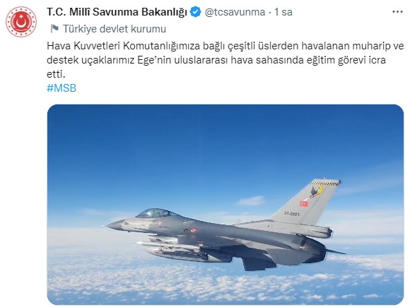 Milli Savunma Bakanlığı'nın sosyal medya hesabından gerçekleştirilen paylaşımda "Hava Kuvvetleri Komutanlığımıza bağlı çeşitli üslerden havalanan muharip ve destek uçaklarımız Ege'nin uluslararası hava sahasında eğitim görevi icra etti" ifadelerine yer verildi.