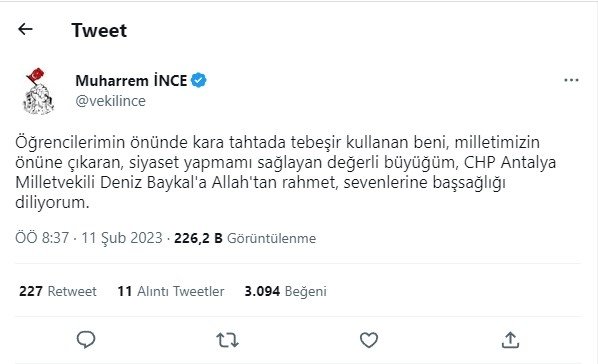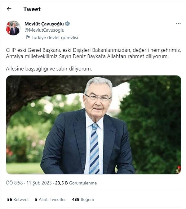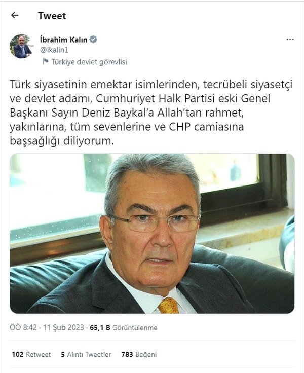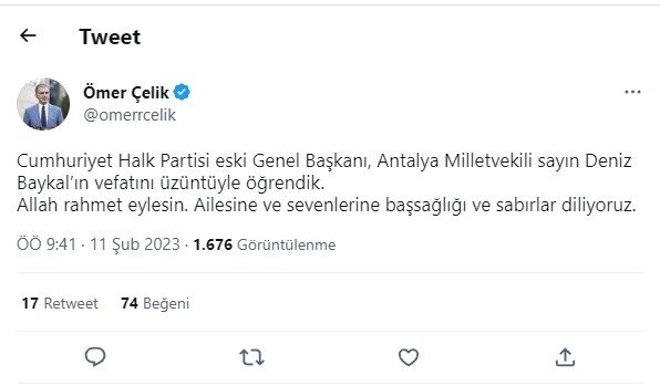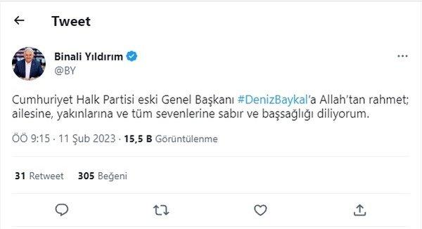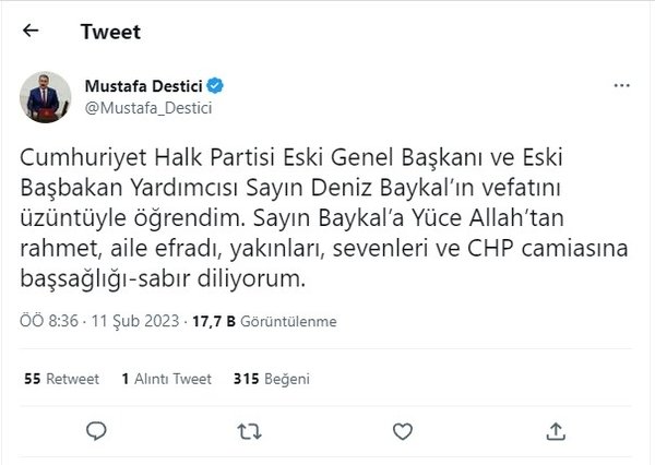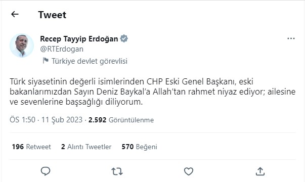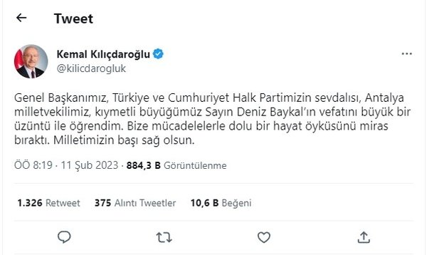 Eski CHP Genel Başkanı Deniz Baykal, Ankara'da yaşamını yitirdi. CHP Genel Başkanı Kemal Kılıçdaroğlu, Twitter'dan yaptığı açıklamada, "Genel Başkanımız, Türkiye ve Cumhuriyet Halk Partimizin sevdalısı, Antalya milletvekilimiz, kıymetli büyüğümüz Sayın Deniz Baykal'ın vefatını büyük bir üzüntü ile öğrendim. Bize mücadelelerle dolu bir hayat öyküsünü miras bıraktı. Milletimizin başı sağ olsun" dedi. Başkan Erdoğan sosyal medya hesabından yaptığı paylaşımda "Türk siyasetinin değerli isimlerinden CHP Eski Genel Başkanı, eski bakanlarımızdan Sayın Deniz Baykal'a Allah'tan rahmet niyaz ediyor; ailesine ve sevenlerine başsağlığı diliyorum." ifadelerini kullandı.
