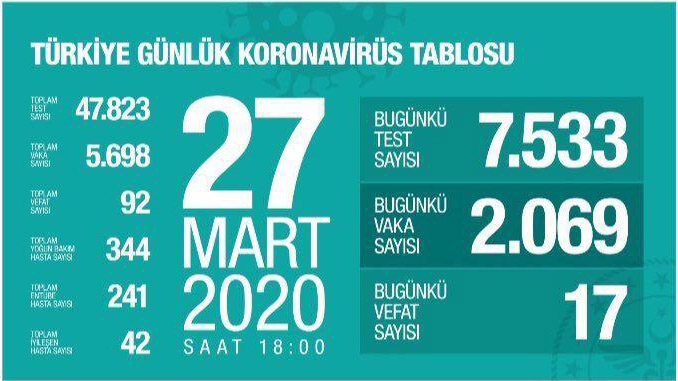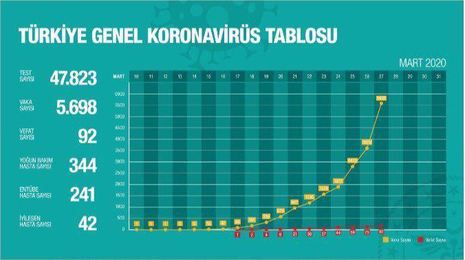 Sağlık Bakanlığı tarafından yapılan açıklamaya göre, Türkiye'de corona virüsünden ölenlerin sayısı 92'e yükseldi, 42 kişi iyileşti, vaka sayısı ise 5.698 oldu.