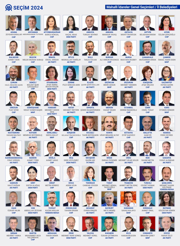 MHP, Çankırı, Erzincan, Gümüşhane, Karaman, Kars, Kırklareli, Osmaniye, Tokat illerinde başkanlığı kazanırken, YRP Yozgat'ta, İyi Parti Nevşehir'de, DEM Parti ise Ağrı, Batman, Bitlis, Hakkari, Iğdır, Muş, Siirt, Tunceli'de seçimi kazandı. Büyük Birlik Partisi (BBP) ise sadece Sivas'ta belediye başkanlığını kazandı.