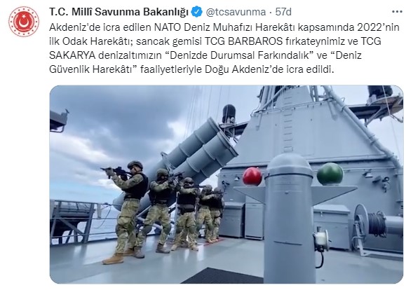 Milli Savunma Bakanlığınca konu hakkında yapılan açıklamada, "Akdeniz'de icra edilen NATO Deniz Muhafızı Harekatı kapsamında 2022'nin ilk odak harekatı, sancak gemisi TCG BARBAROS fırkateynimiz ve TCG SAKARYA denizaltımızın 'Denizde Durumsal Farkındalık' ve 'Deniz Güvenlik Harekatı' faaliyetleriyle Doğu Akdeniz'de icra edildi" denildi.