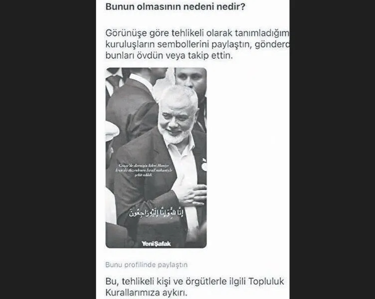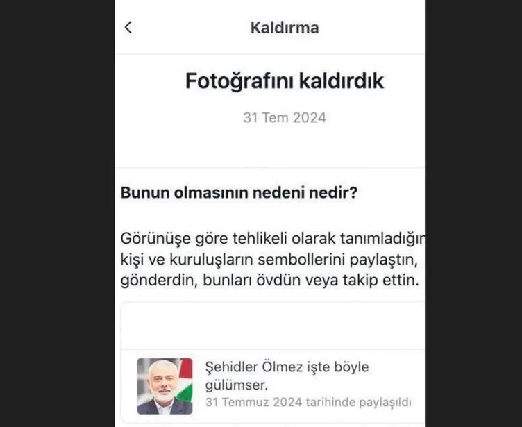 Bugüne kadar yüzlerce kez Atatürk'e hakaret, askerin şehit edilmesi görüntüleri, çocuk istismarı, fuhuş ve kumara yönlendirme gibi pek çok içerik nedeniyle resmi şekilde uyarılan Instagram'ın Türkiye'nin Filistin tutumuna aykırı hareket ederek Hamas lideri Haniye paylaşımlarını engellemesi bardağı taşıran son damla oldu.