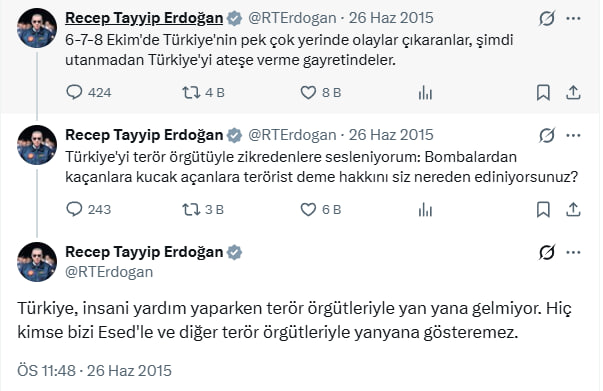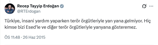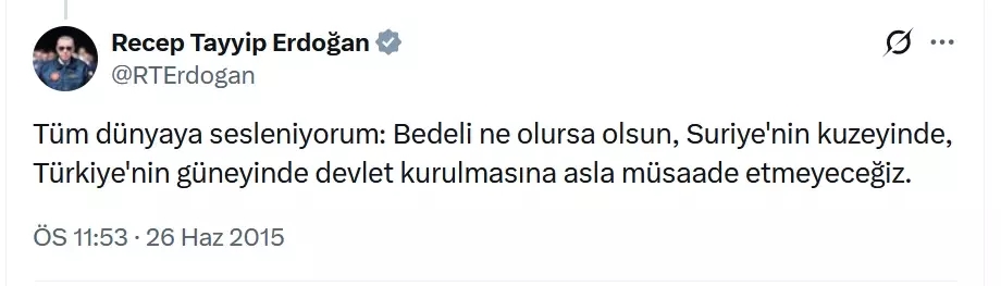 Öte yandan geçtiğimiz gün Cumhurbaşkanlığı Kabine toplantısı sonrası önemli açıklamalarda bulunan Başkan Erdoğan Suriye'de yaşanan son gelişmelere ilişkin bölgede terör devrinin kapandığını belirterek "Suriye Suriyelilerindir. Özgürlük ortamının kalıcı olması için çaba harcıyoruz. Toprak bütünlüğü Suriye için vazgeçilmez. Suriyeli kardeşlerimizin yalnız bırakmadığımız gibi yarında bırakmayacağız." dedi.
