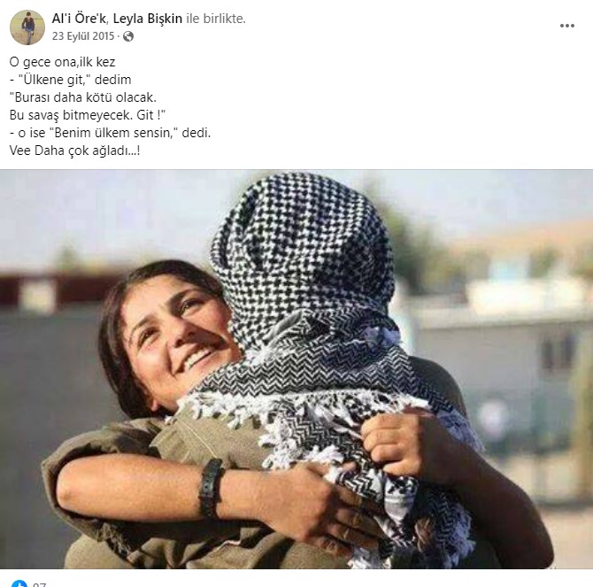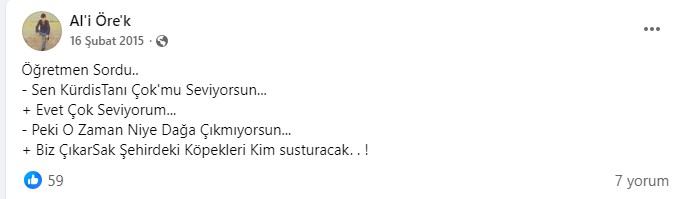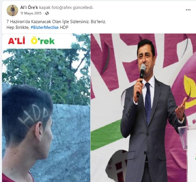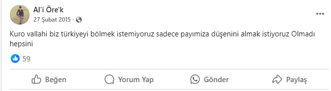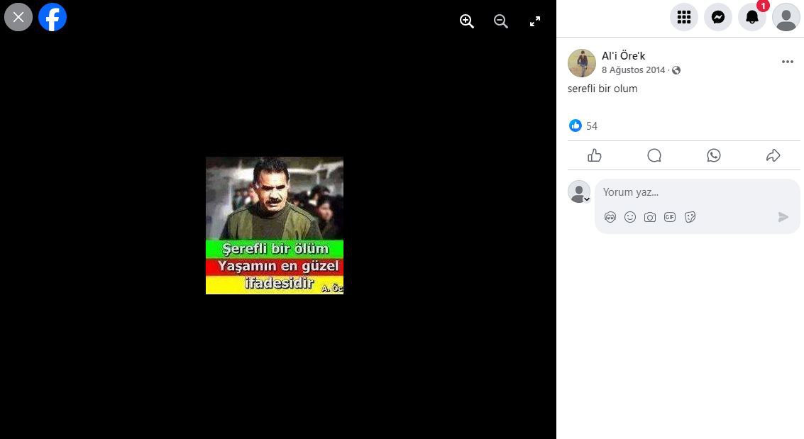 Terörist Örek'in Türkiye'nin bölünmesi için paylaşımlar yaptığı ve Kobani olaylarıyla ilgili de terör örgütünün sözde bayrağını ve renklerini içeren giysiler giydiği görüldü.