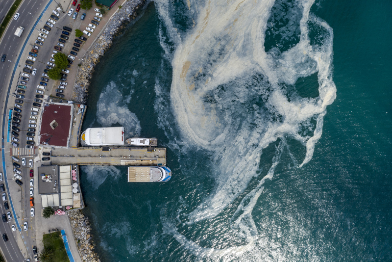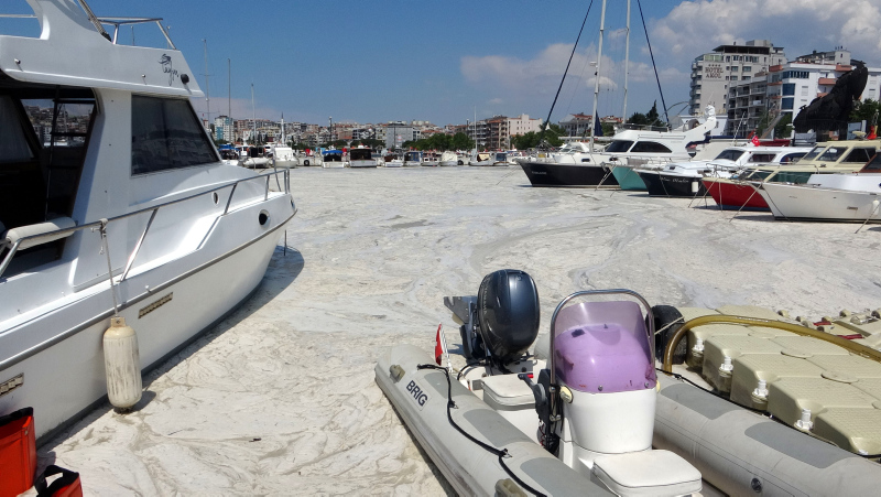 Marmara Denizi'nde son yılların en büyük deniz salyası (müsilaj) yoğunluğu mercan resiflerinin ve balık yuvalarının üzerini halı gibi kaplarken yapay resif olması için batırılan gemileri bile görünmez kılıyor. Müsilajın balıkların bulunduğu alanlarda saçaklar halinde yuva yaptığı tehlikenin boyutunu kanıtlıyor.