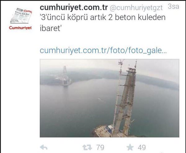 Mimarlar Odası'nın aldığı bir yargı kararını bahane eden Doğan Haber Ajansı ve Cumhuriyet, Dünyada ilklere imza atan 3. köprü için "3. Köprü artık iki beton kuleden ibaret" manşetleri atmıştı.