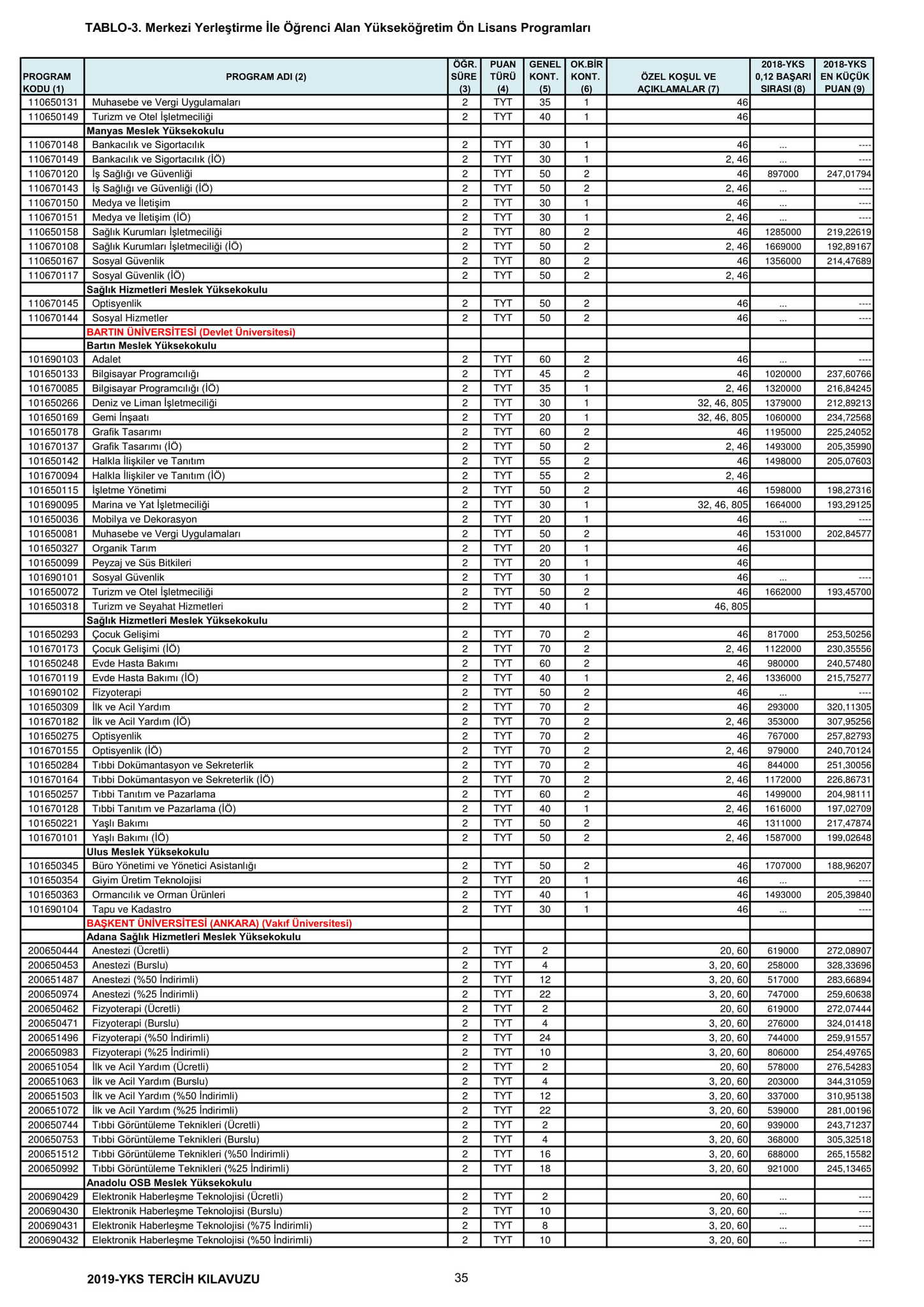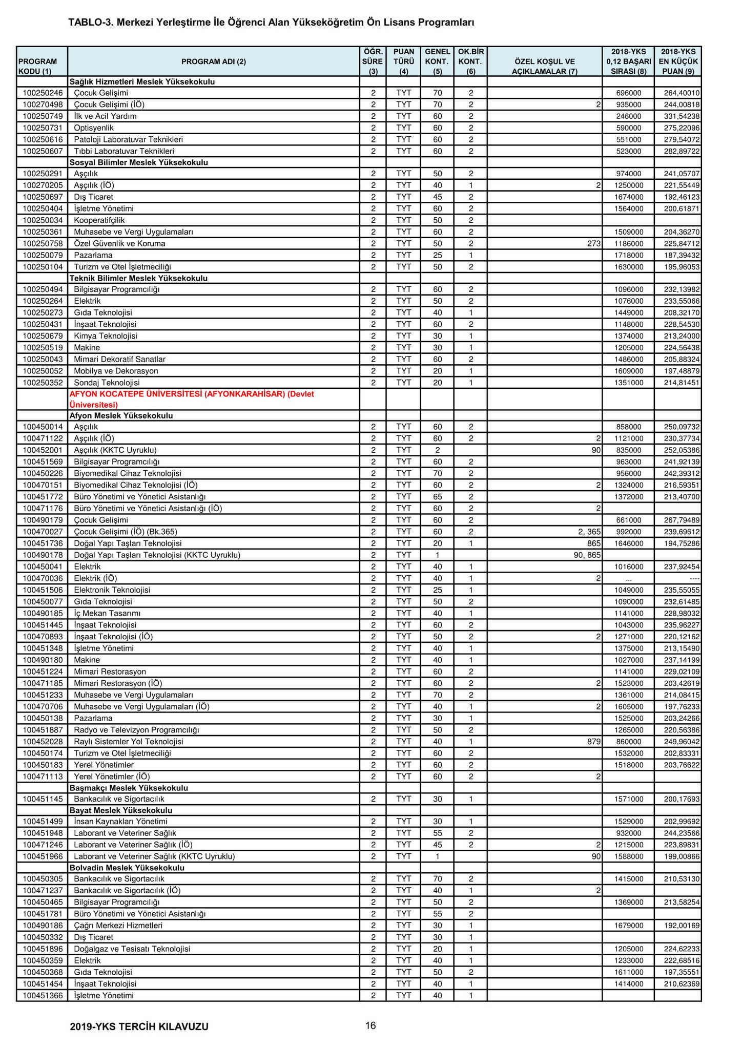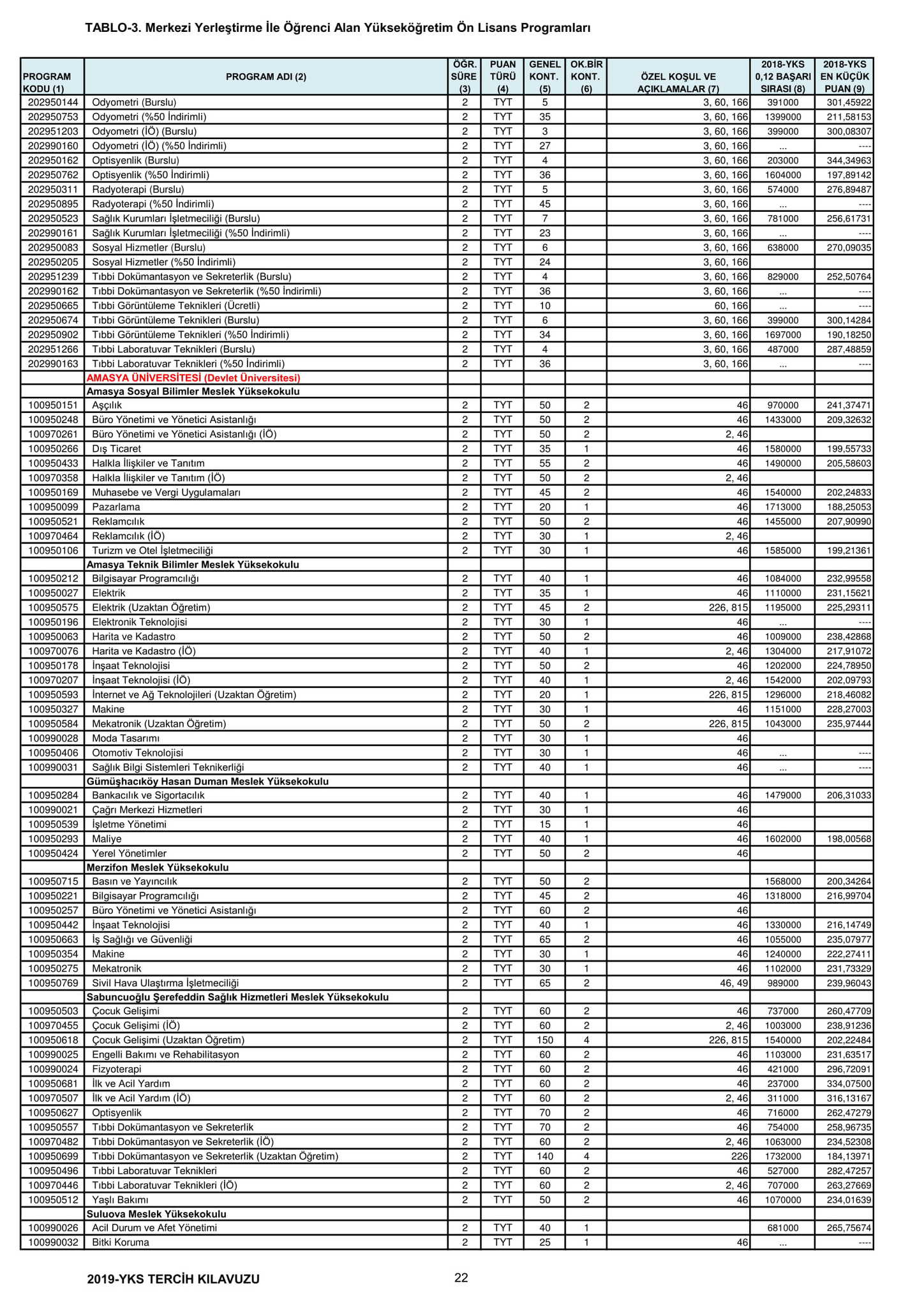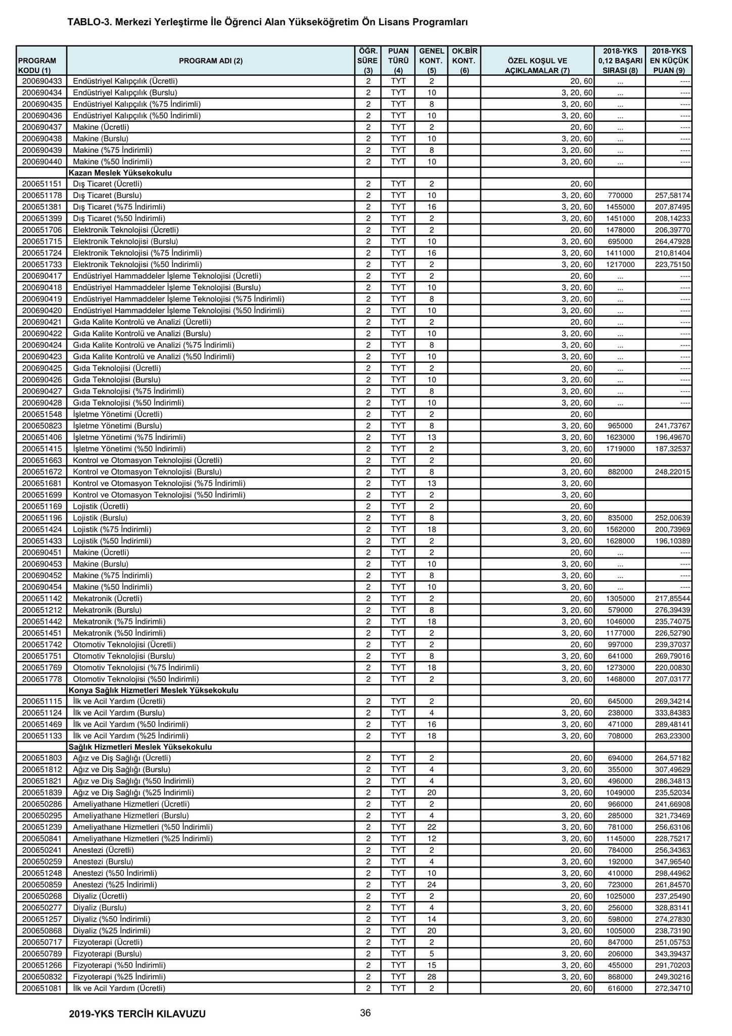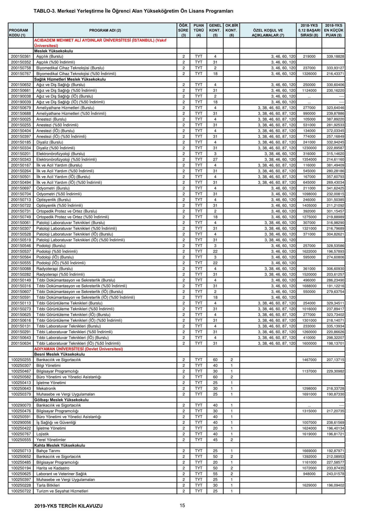 TYT'de 150 ve üzeri puan alan adaylar ön lisans programlarını, Alan Yeterlilik Testi (AYT) veya Yabancı Dil Testi'nin (YDT) ilgili puan türünde 180 ve daha fazla puan alanlar lisans programlarını tercih edebilecek.