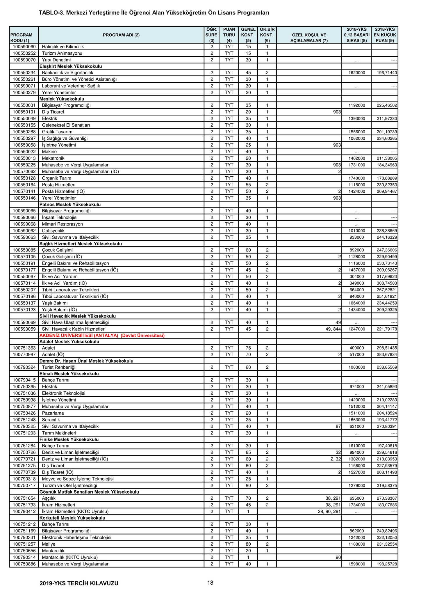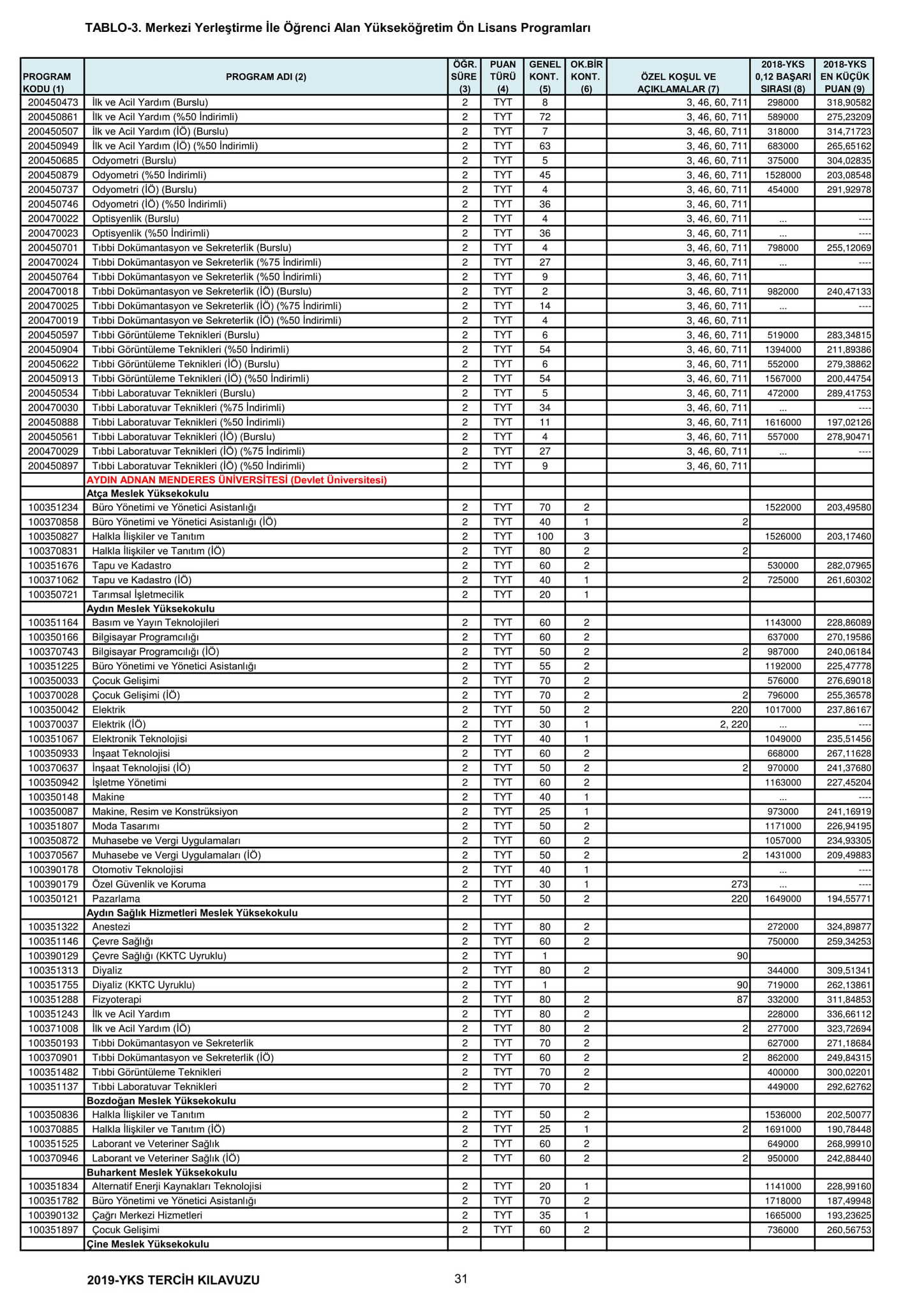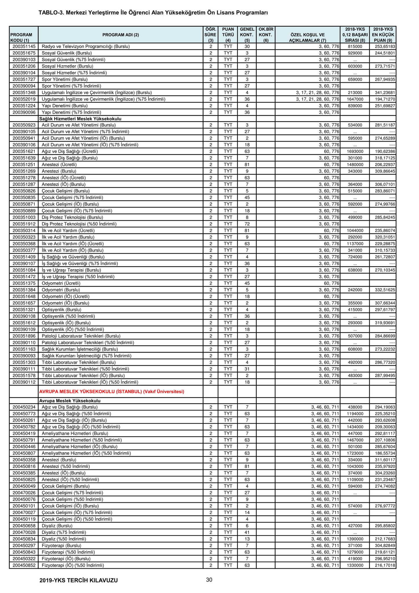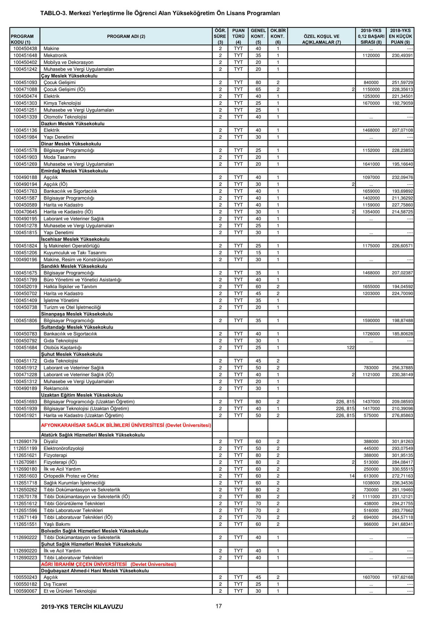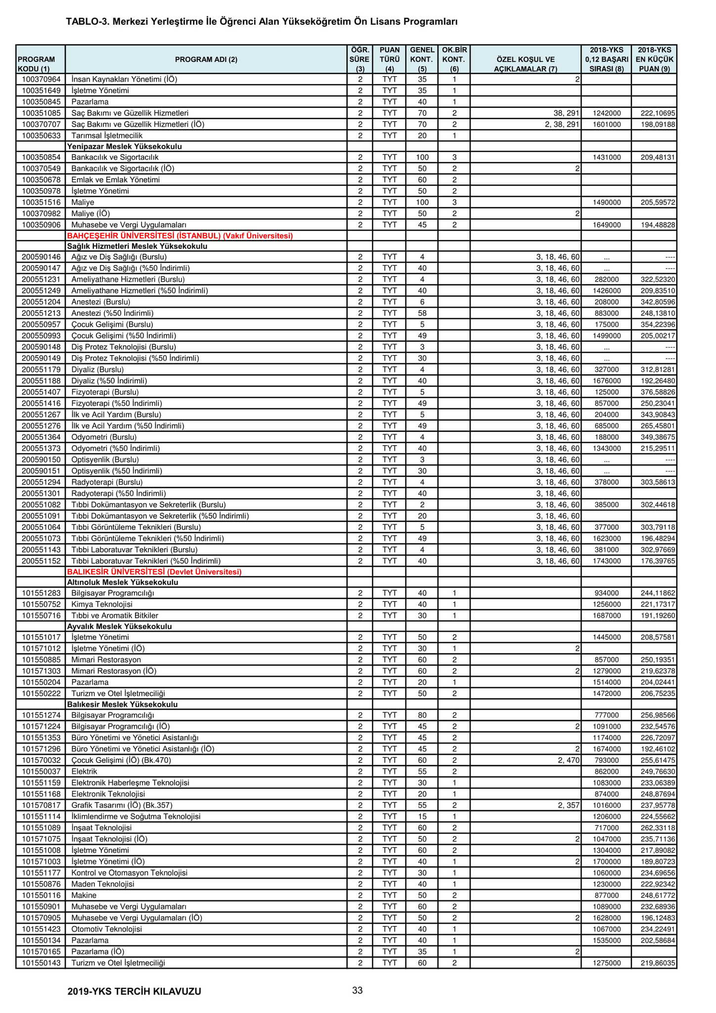TYT'de 150 ve üzeri puan alan adaylar ön lisans programlarını, Alan Yeterlilik Testi (AYT) veya Yabancı Dil Testi'nin (YDT) ilgili puan türünde 180 ve daha fazla puan alanlar lisans programlarını tercih edebilecek.
