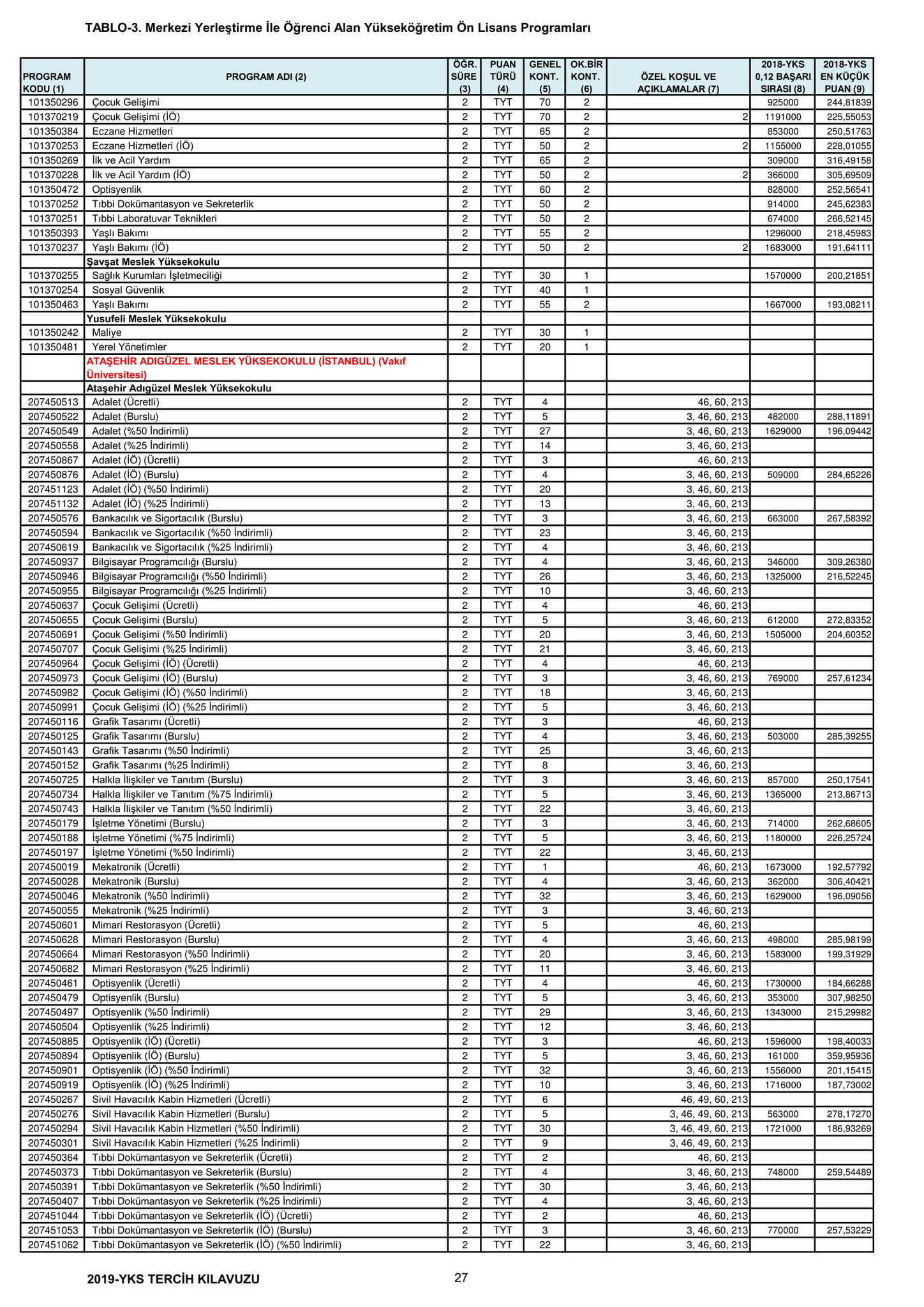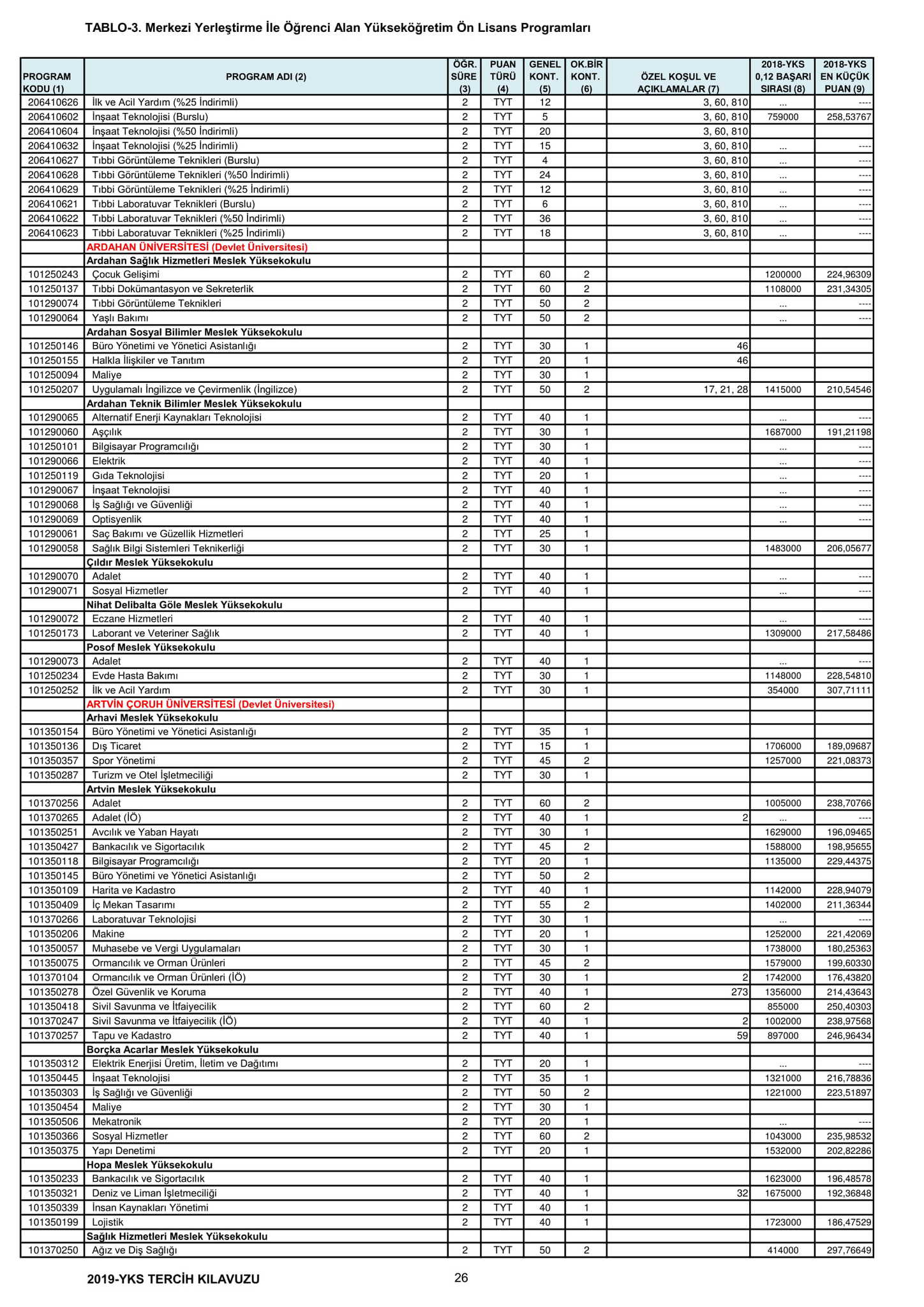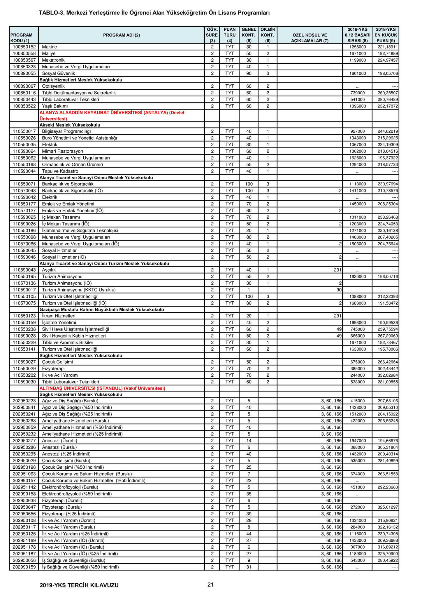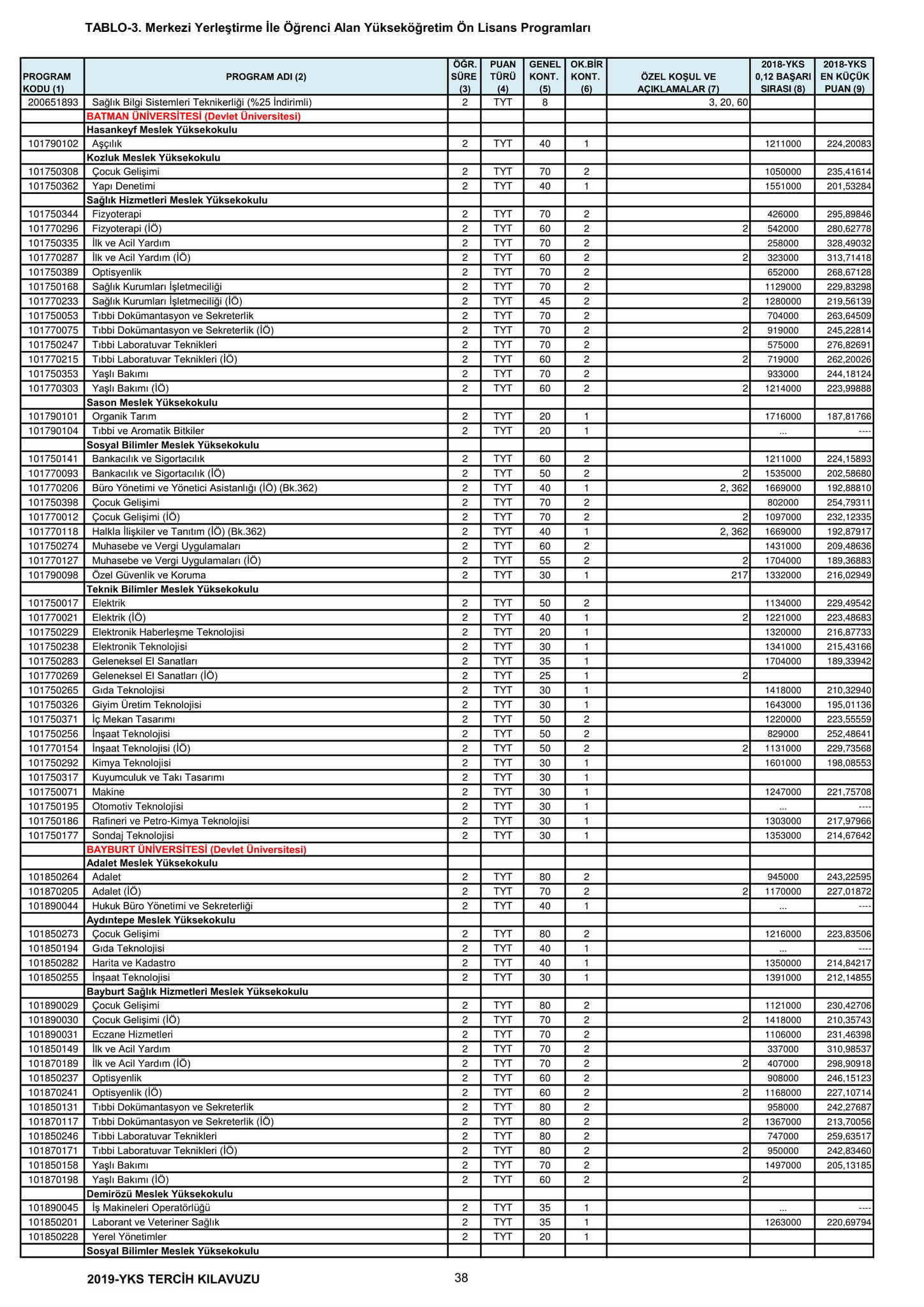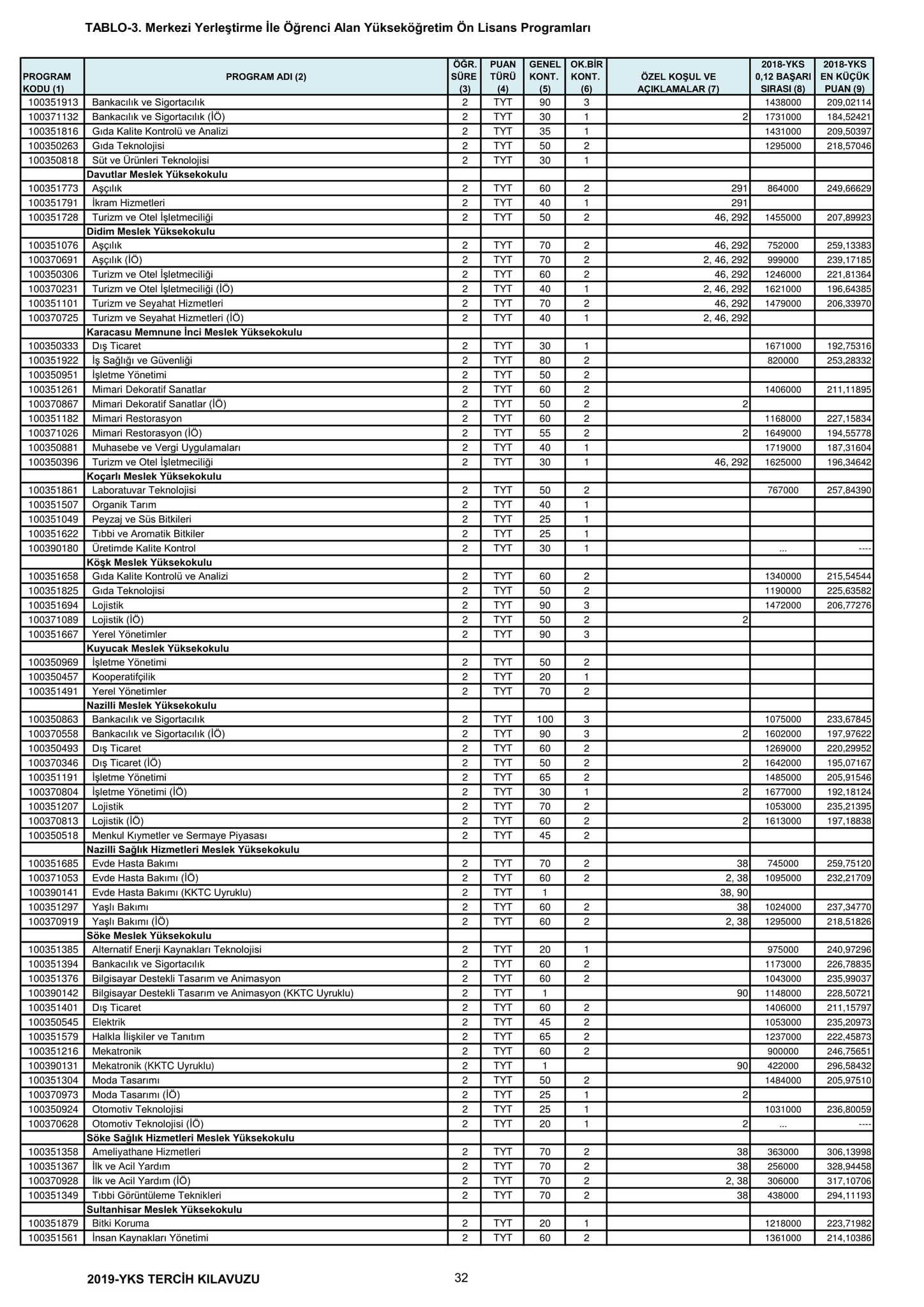 TYT'de 150 ve üzeri puan alan adaylar ön lisans programlarını, Alan Yeterlilik Testi (AYT) veya Yabancı Dil Testi'nin (YDT) ilgili puan türünde 180 ve daha fazla puan alanlar lisans programlarını tercih edebilecek.