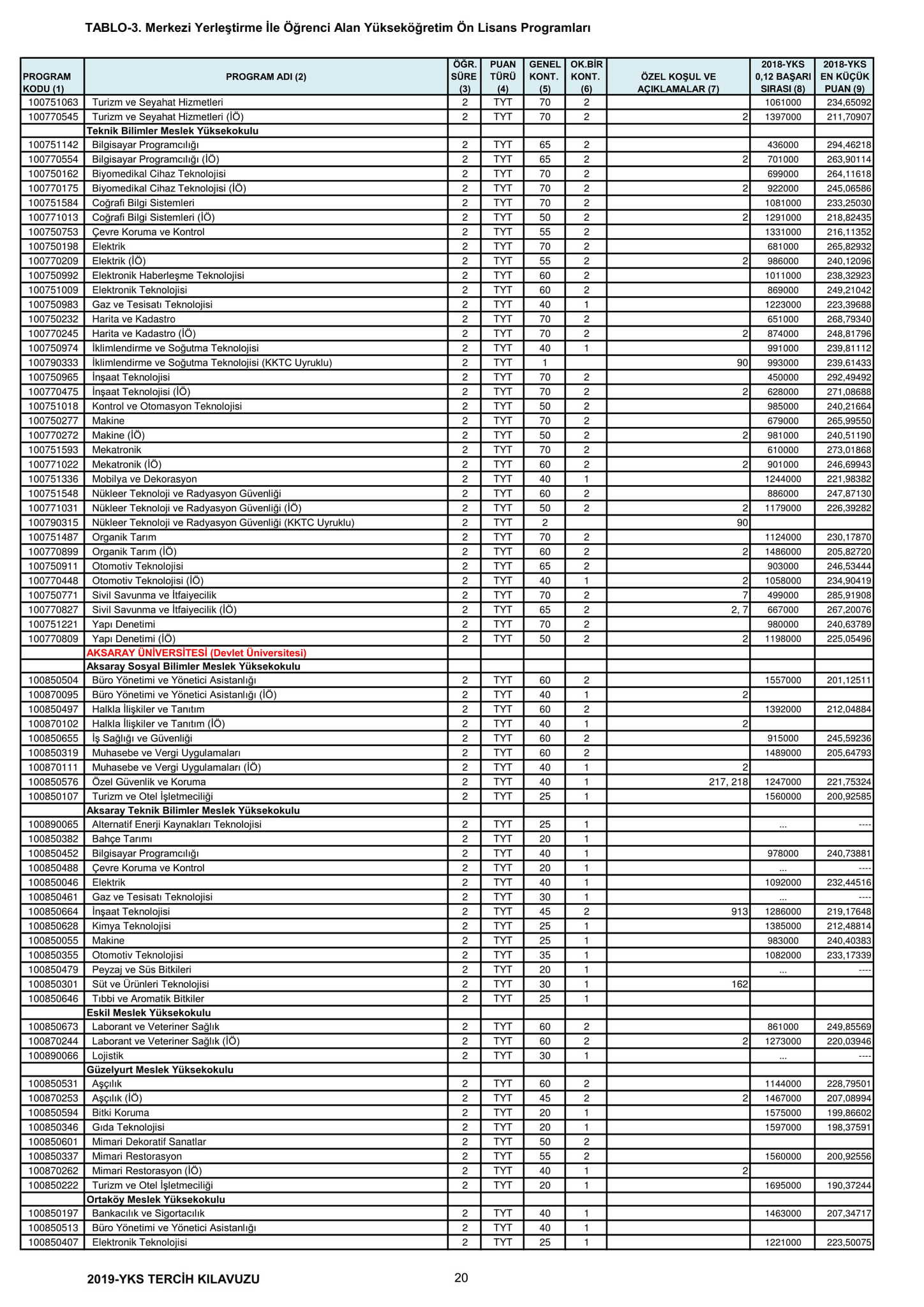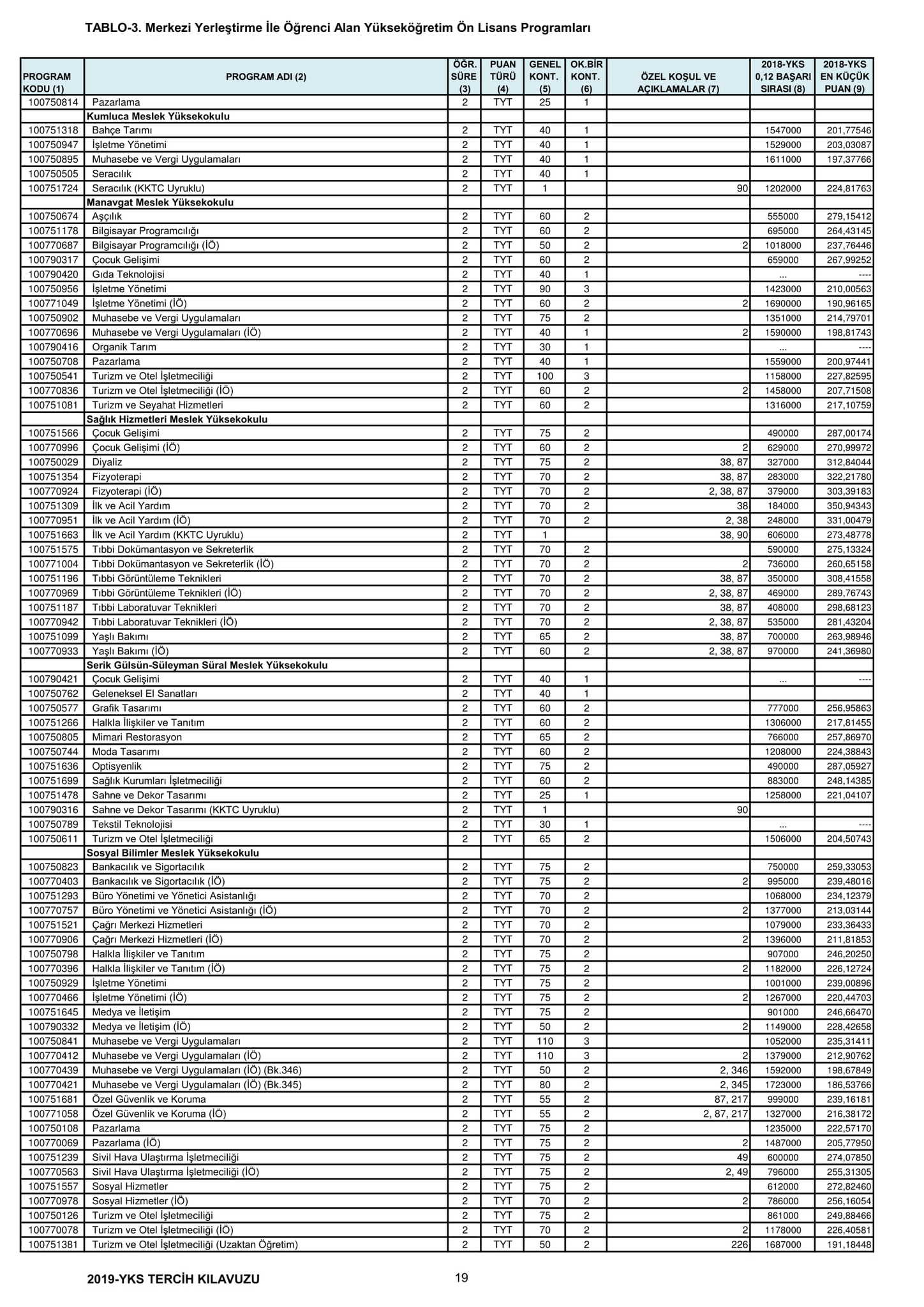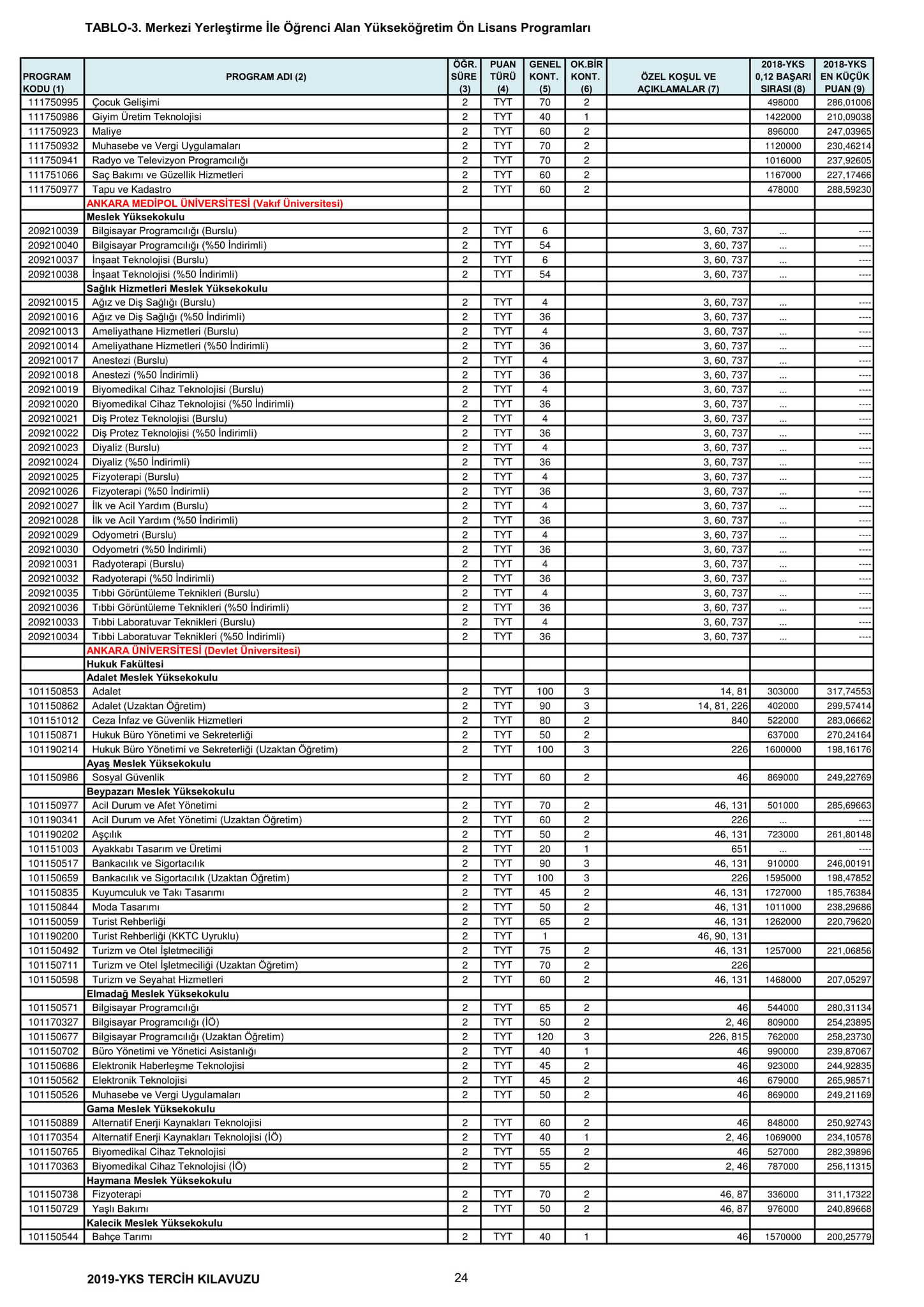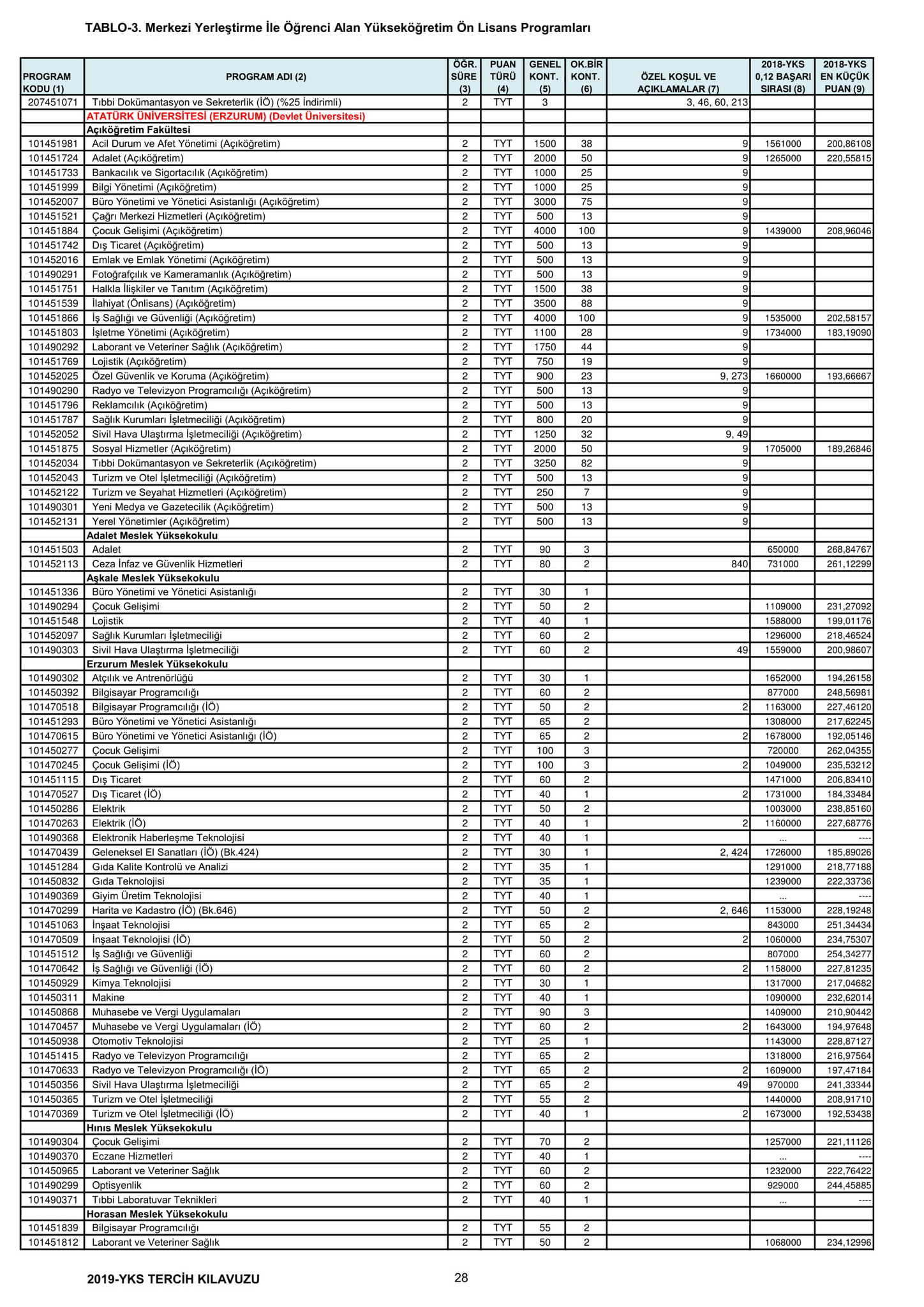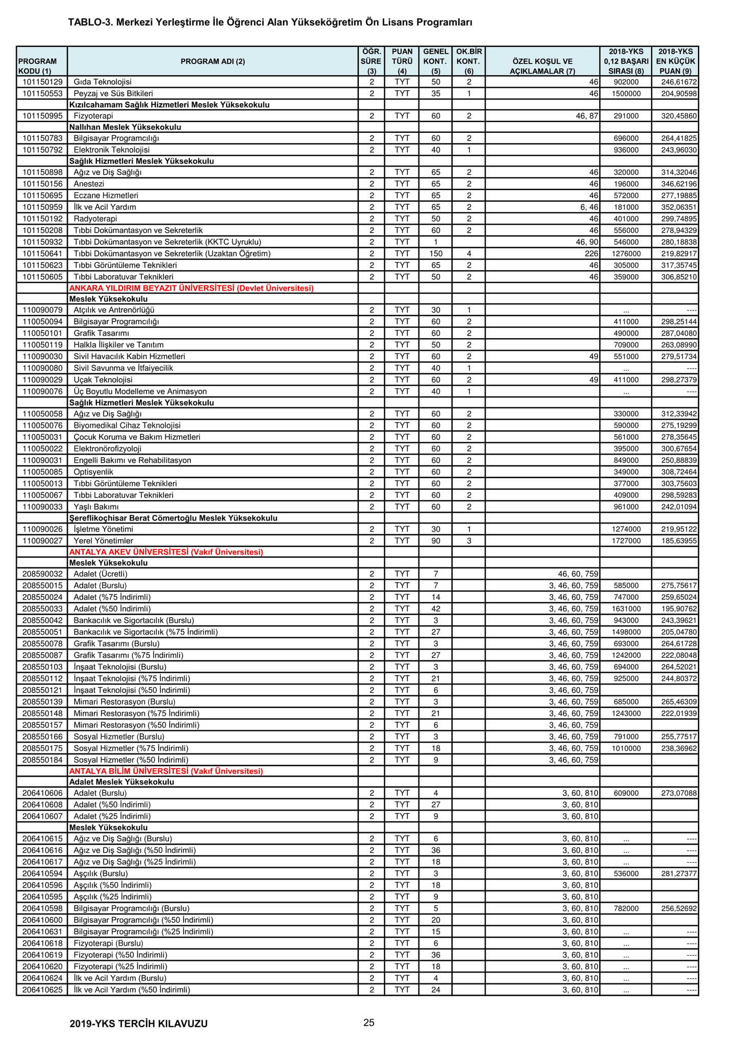 Temel Yeterlilik Testi (TYT) puanı en az 150 olan adaylar, yerleştirmede kullanılacak Y-TYT ve varsa Y-SAY, Y-SÖZ, Y-EA, Y-DİL puanlarına göre tercihte bulunacak.