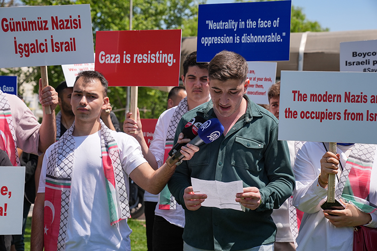 Grup adına açıklama yapan öğrencilerden Kadir Gülhan, İsrail'in yayılmacılığının 7 Ekim 2023 itibariyle insanlığın utanç tablosu olarak değerlendireceği bir soykırım halini aldığını söyledi.