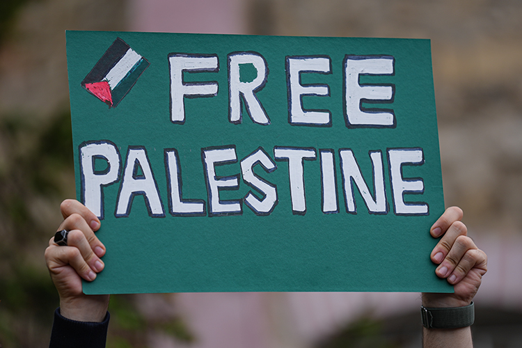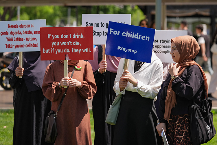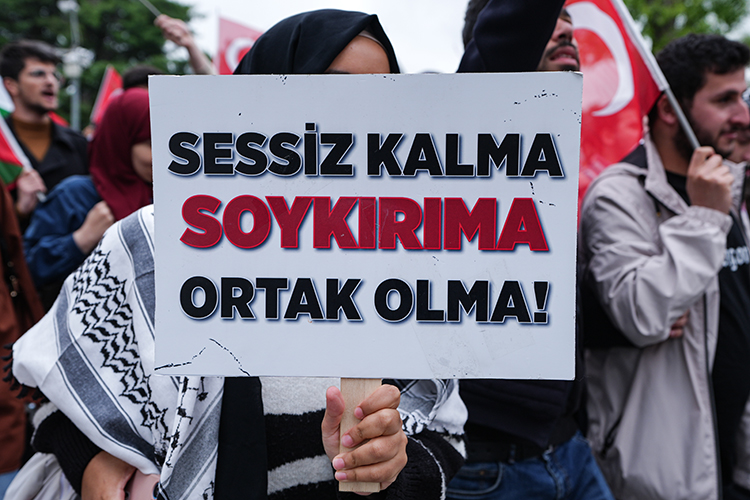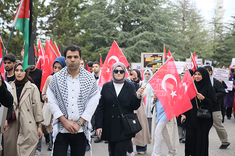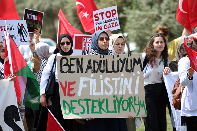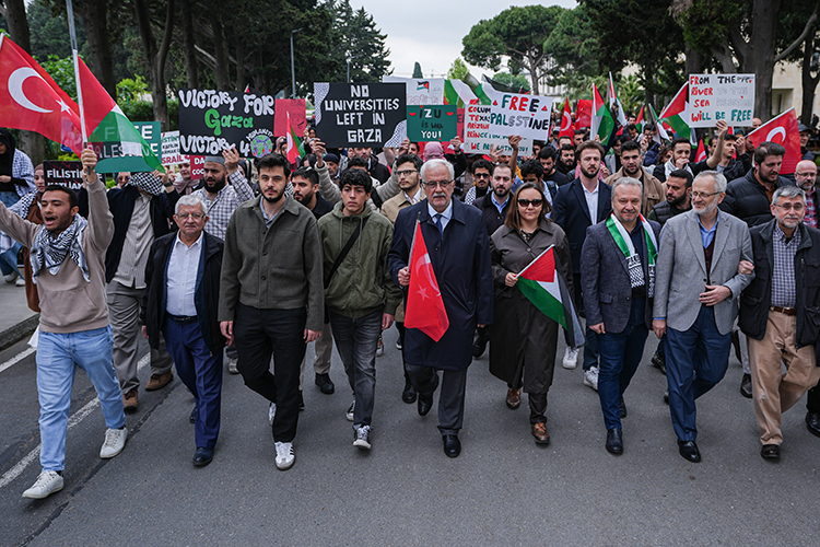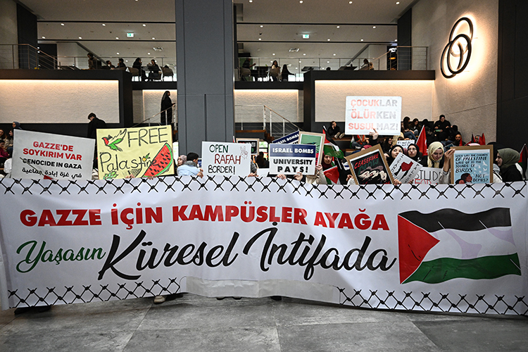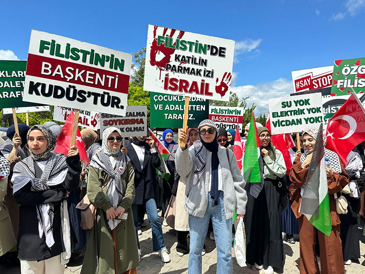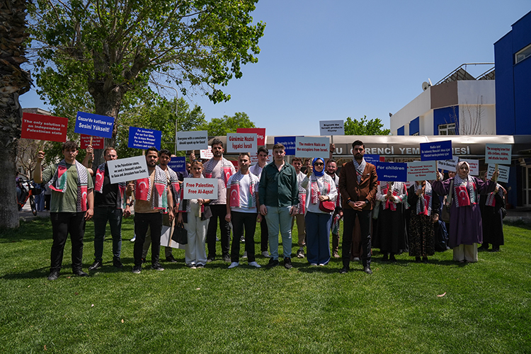 "Filistin'in başkenti Kudüs'tür", "Sessiz kalma, soykırıma ortak olma", "Çocuklar ölürken susulmaz", "Gazze'de soykırım var", "Müslüman zulme boyun eğmez" yazılı dövizler de taşıyan öğrenciler, "Kampüsler meydanda, direniş her yerde", "Direnen Filistin kazanacak", "Gazze halkı yalnız değildir", "Kampüslerden Gazze'ye direnişe bin selam" sloganları attı.