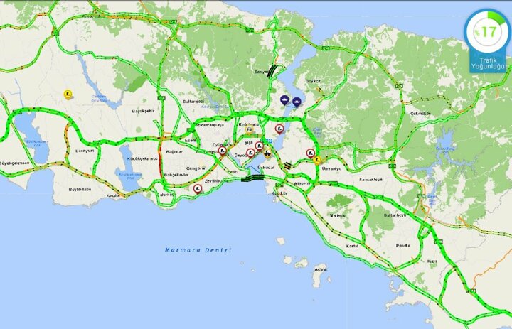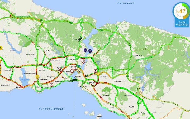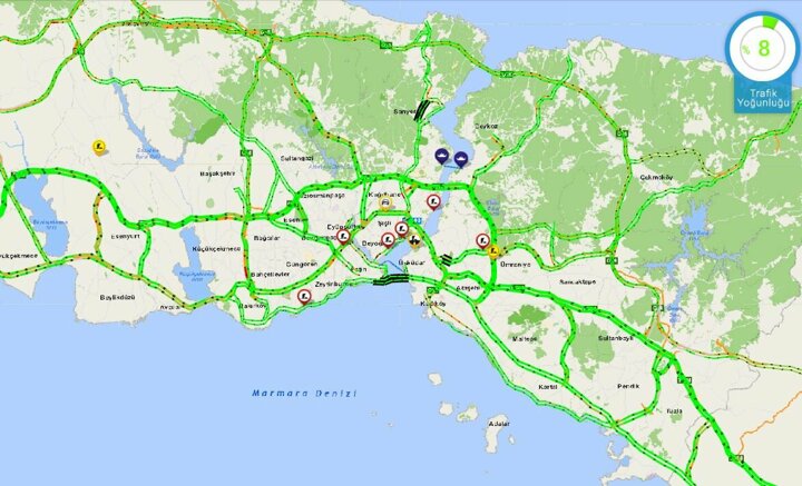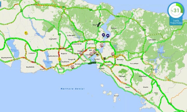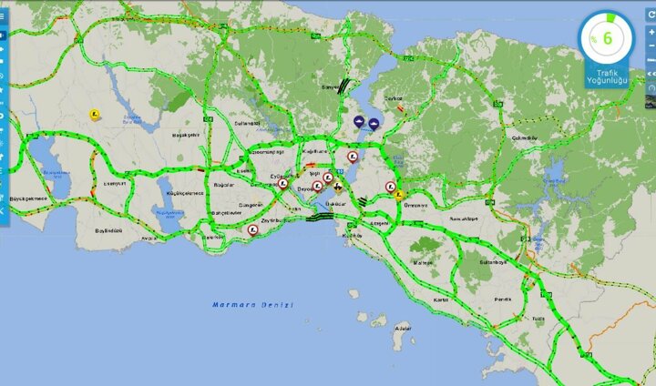 İstanbul Büyükşehir Belediyesi'nin trafik yoğunluk haritasında saat 15.00'ta kentte yoğunluk yüzde 6 seviyesindeydi.