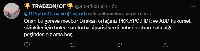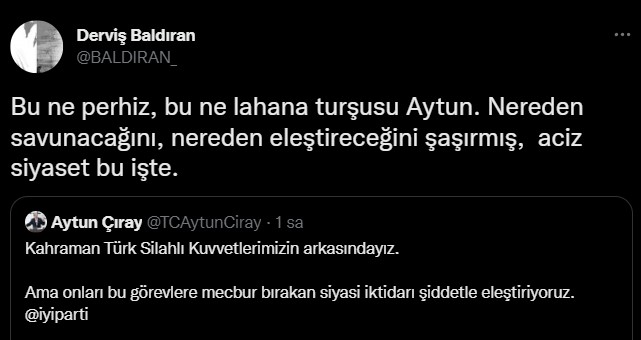 İYİ Partili Aytun Çıray, katıldığı canlı yayında, Türk Silahlı Kuvvetlerinin PKK/YPG'ye yönelik operasyonuna ilişkin çelişkili ifadeler kullandı. Mehmetçik'in arkasında olduklarını belirten Çıray, "Ama onları bu görevlere mecbur bırakan siyasi iktidarı şiddetle eleştiriyoruz." dedi. Çıray, geride kalan gün de operasyon üzerinden iktidarı hedef almış, "ABD'ye bilgi verildi mi? Sizce teröristler ne yapmıştır?" sözleriyle tepki çekmişti. Vatandaşlar Çıray'ın ikiyüzlü tutumuna tepki gösterip, yerli ve milli olmamakla itham etti.