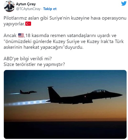 İYİ Parti İzmir Milletvekili ve Genel Başkan Danışmanı Aytun Çıray, Türk Silahlı Kuvvetleri'nin Suriye ve Kuzey Irak'a yaptığı hava harekatının ardından skandal bir paylaşımda bulundu.