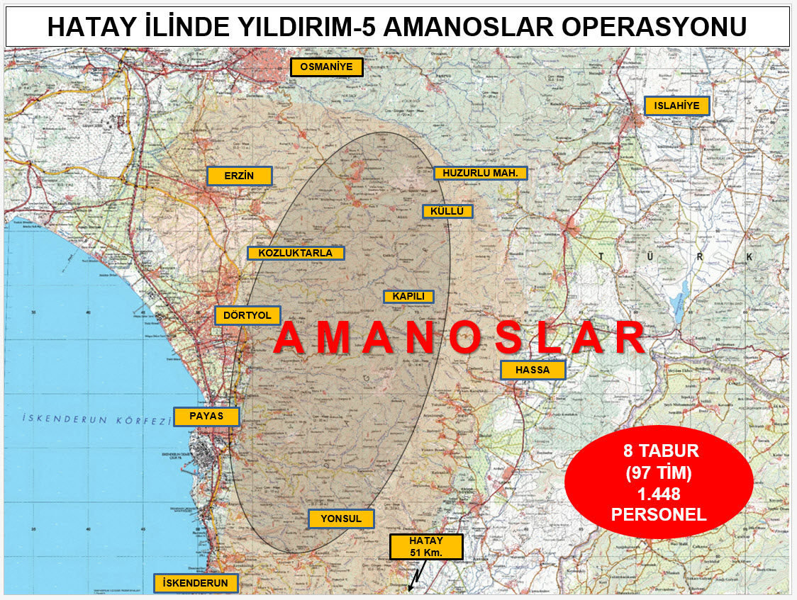 Bölücü terör örgütünü tamamen ülke gündeminden çıkarmak ve bölgede barındığı değerlendirilen teröristleri etkisiz hale getirmek maksadıyla Adana Jandarma Bölge Komutanlığınca "YILDIRIM-5 AMANOSLAR" Operasyonu başlatılmıştır.