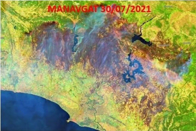 Tarihler 2 Ağustos'u gösterdiğinde iki bölgeyi kaplayan ormanlar yerini büyük ölçüde kahverengi alana bıraktı. Uydu görüntüsünün alındığı tarihte devam eden yangınları da görmek mümkün.
