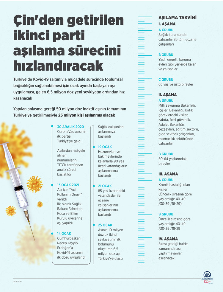 Dünyada aşı geliştirme çalışmalarını yakından takip eden Türkiye, Çinli Sinovac firmasınca üretilen CoronaVac aşısının temini için anlaşma yaptı. Bu kapsamda, bu yıl içinde temin edilecek toplam 50 milyon doz aşının ilk sevkiyatını oluşturan 3 milyon doz Türkiye getirilmiş, 14 Ocak'tan itibaren de sırasıyla sağlık çalışanlarına, huzurevleri ve bakımevlerinde kalanlarla onların bakımından sorumlu kişilere, 85 yaş ve üzerindeki vatandaşlara uygulanmaya başlanmıştı.