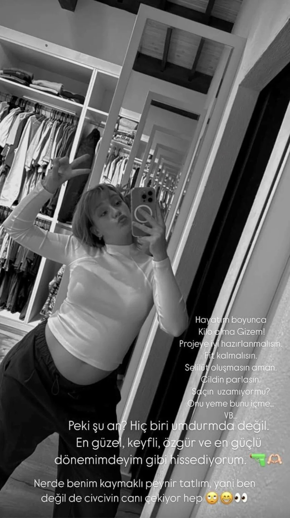Anne olacak olmanın sevincini yaşayan Gizem Karaca, hamilelik sürecine dair hislerini "Hayatım boyunca, 'Kilo alma Gizem, projeye hazırlanmalısın. Fit kalmalısın. Selülit oluşmasın aman. Cildin parlasın. Saçın uzamıyor mu? Onu yeme, bunu içme...' Peki şu an? Hiçbiri umurumda değil.
