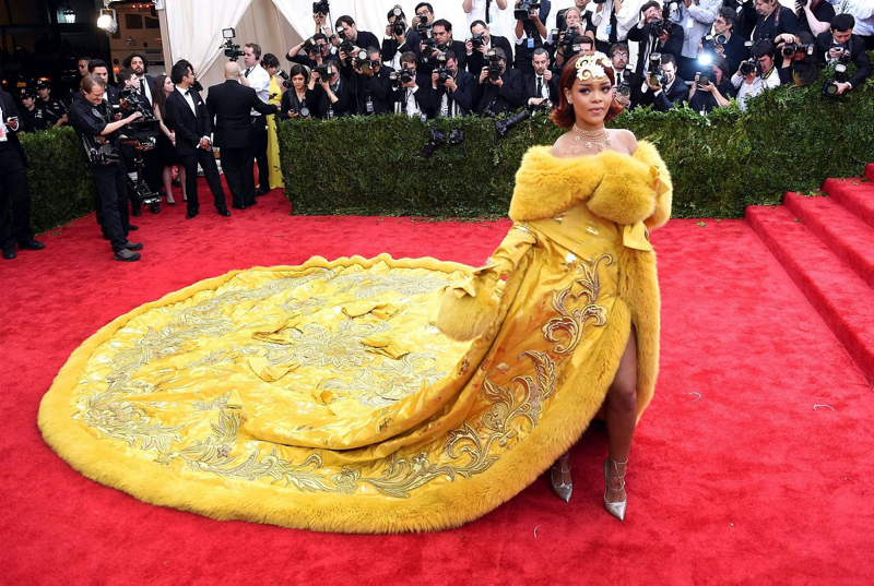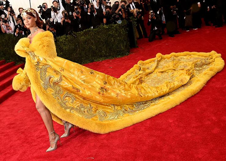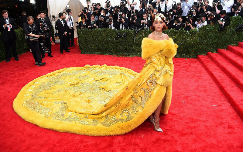 32 yaşındaki Barbadoslu şarkıcı, Guo Pei imzalı elbisesiyle o yıl Vogue dergisinin de kapağını süslemişti ancak kıyafeti sosyal medyada elbise pizza ve omlet gibi yiyeceklere benzetilmişti.