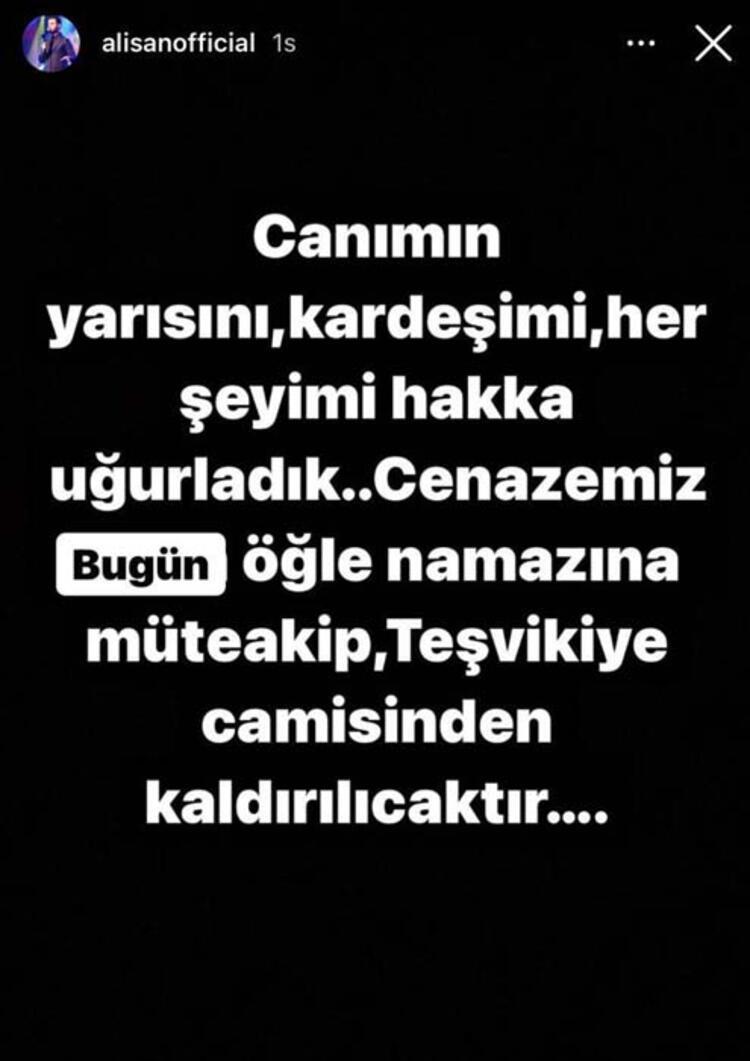 Şarkıcı paylaşımında, "Canımın yarısını, kardeşimi, her şeyimi hakka uğurladık... Bugün öğle namazına müteakip, Teşvikiye Camii'nden kaldırılacaktır." ifadelerine yer verdi.