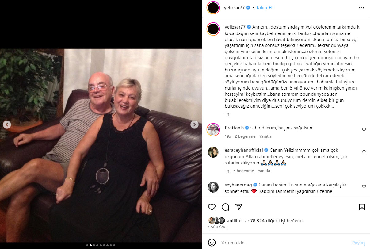 Yeliz Şar, gözyaşlarıyla annesini son yolculuğuna uğurlamıştı. Annesini toprağa veren Yeliz Şar, Şehriban Şule Şar'a sosyal medya hesabından paylaştığı duygusal bir notla veda etti.