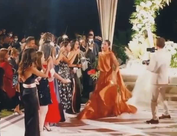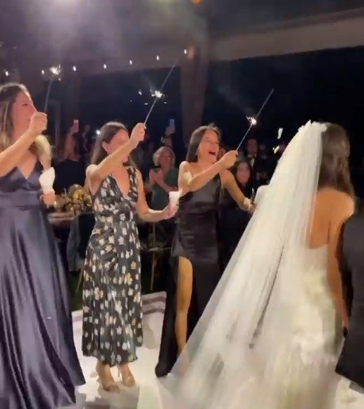 İki yıllık ilişkilerini evlilikle taçlandıran ünlü çiftin düğününde panik anı yaşandı. Düğün alanına giren ünlü çifti, arkadaşları ellerinde maytaplarla karşıladı.