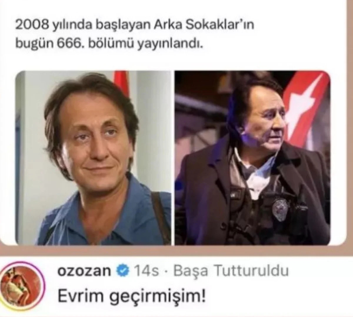 Türk televizyon tarihinde önemli bir yere sahip olan Arka Sokaklar dizisi, 666. bölümüyle izleyicilerle buluştu. Özellikle dizinin sevilen karakterlerinden Hüsnü Çoban'ı canlandıran Özgür Ozan'ın yıllar içindeki değişimi herkesi şaşırtıyor. Ozan, dizideki değişimini gördüğü bir paylaşım üzerine espriyle karşılık vererek, "Evrim geçirmişim" dedi.