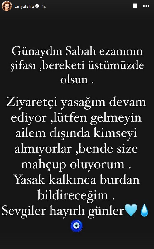 Tanyeli "Günaydın, sabaha ezanının şifası, bereketi üstümüzde olsun. Ziyaretçi yasağım devam ediyor. Lütfen gelmeyin. Ailem dışında kimseyi almıyorlar. Ben de size mahcup oluyorum. Yasak kalkınca buradan bildireceğim. Sevgiler, hayırlı günler..." ifadelerini kullandı.