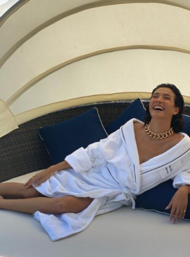 Tatilden karelerini sık sık takipçileriyle paylaşan Pusat, son olarak bornozuyla verdiği pozu yayınladı.
