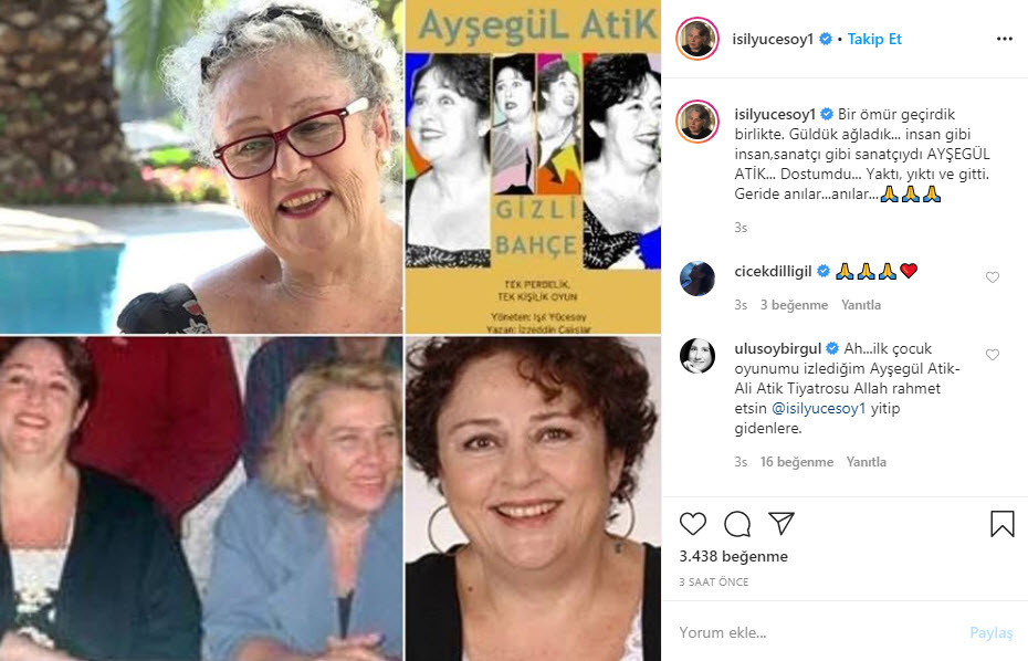 Bir ömür geçirdik birlikte güldük ağladık. İnsan gibi insan, sanatçı gibi sanatçıydı. Ayşegül Atik dostumdu. Yaktı, yıktı ve gitti. Geride anılar anılar