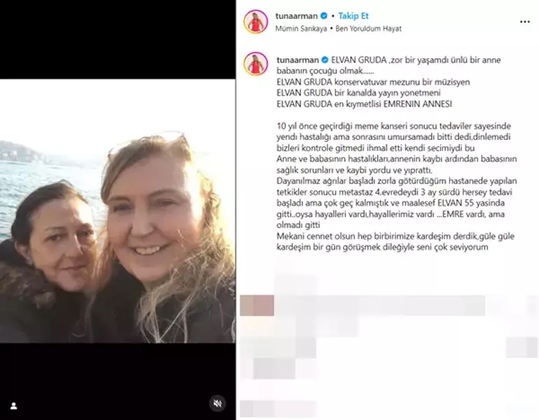 "Zor bir yaşamdı ünlü bir anne-babanın çocuğu olmak... Elvan Gruda konservatuvar mezunu bir müzisyen, bir kanalda yayın yonetmeni, en kıymetlisi Emre'nin annesi... 10 yıl önce geçirdiği meme kanserini tedaviler sayesinde yendi ama sonrasını umursamadı. 'Bitti' dedi, dinlemedi bizleri, kontrole gitmedi, ihmal etti. Kendi seçimiydi bu. Anne ve babasının hastalıkları, annesinin kaybı, ardından babasının sağlık sorunları ve kaybı yordu ve yıprattı onu. Dayanılmaz ağrıları başladı, zorla götürdüğüm hastanede yapılan tetkikler sonucu metastaz 4'üncü evredeydi. 3 ay sürdü her şey. Tedavi başladı ama çok geç kalmıştık. Maalesef Elvan 55 yaşında gitti... Oysa hayalleri vardı, hayallerimiz vardı. Emre vardı, ama olmadı; gitti. Mekanı cennet olsun. Hep birbirimize 'kardeşim' derdik, güle güle kardeşim. Bir gün görüşmek dileğiyle, seni çok seviyorum."