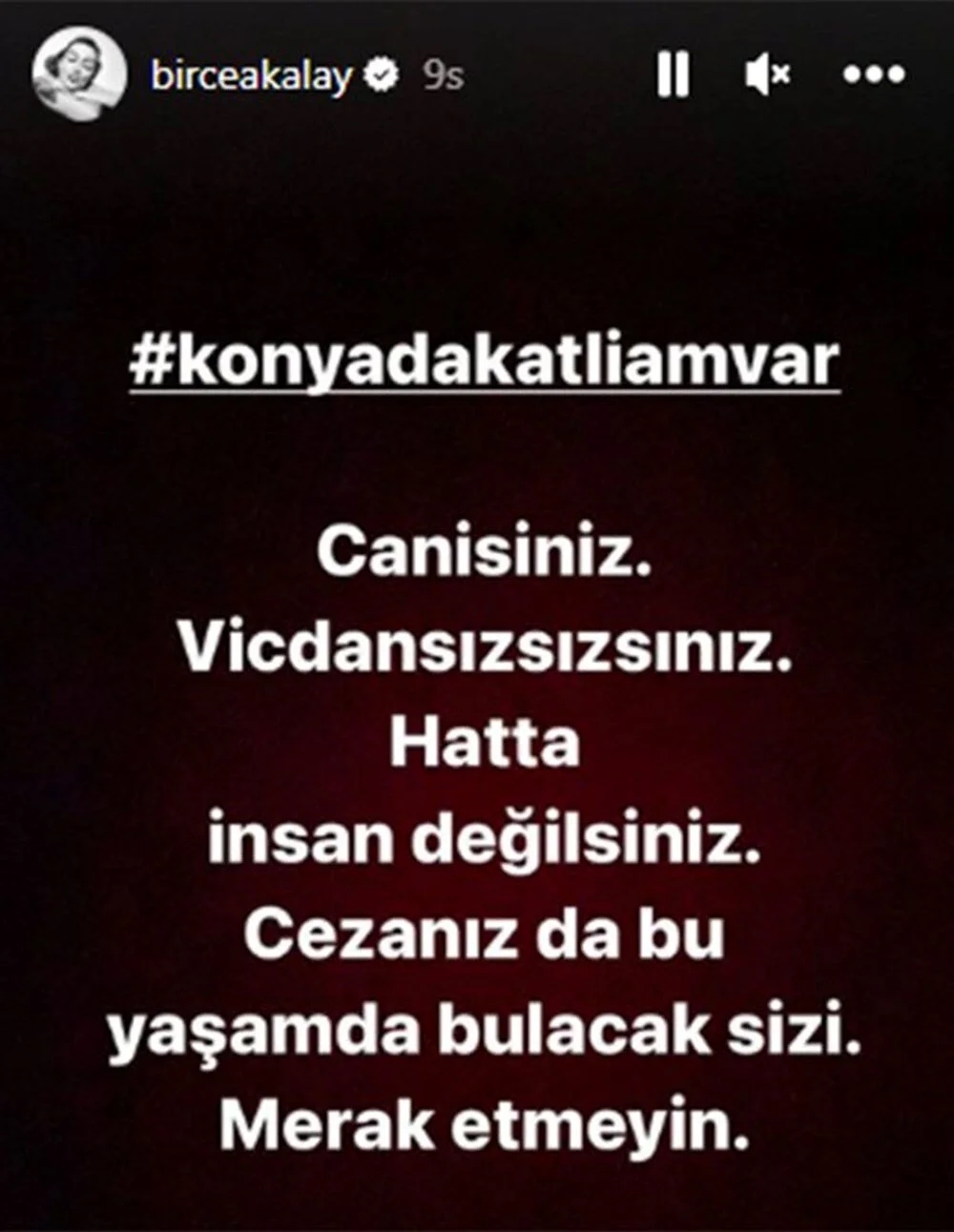 Instagram hesabından paylaşım yapan oyuncu Birce Akalay "Canisiniz, vicdansızsınız hatta insan değilsiniz. Cezanız da bu yaşamda bulacak sizi. Merak etmeyin" ifadelerini kullandı.
