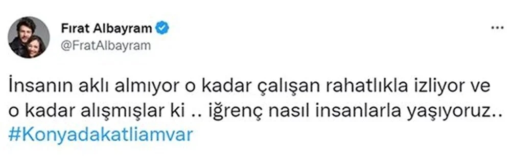 Oyuncu Fırat Albayram, "İnsanın aklı almıyor o kadar çalışan rahatlıkla izliyor ve o kadar alışmışlar ki... İğrenç! Nasıl insanlarla yaşıyoruz" diye tweet attı.