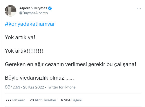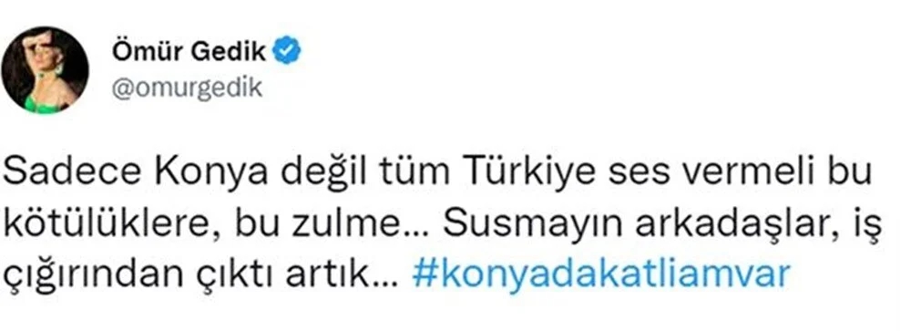 Şarkıcı Cenk Eren, paylaşımına "Eğer biraz vicdanınız varsa bütün eşime, dostuma, şarkıcı arkadaşlarıma, oyunculara, gazetecilere tiyatroculara sesleniyorum. Bu vahşete ses verin, yoksa hiçbirimiz Allah'a bunun hesabını veremeyiz" mesajını yazdı.