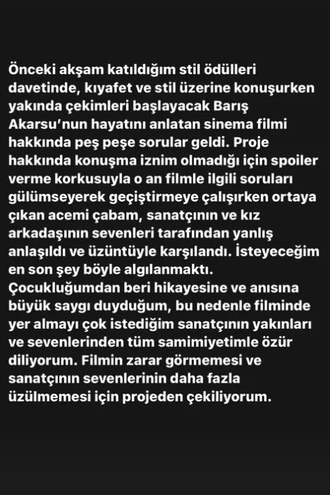 "Önceki akşam katıldığım stil ödülleri davetinde, kıyafet ve stil üzerine konuşurken yakında çekimleri başlayacak olan Barış Akarsu'nun hayatını anlatan sinema filmi hakkında peş peşe sorular geldi. Proje hakkında konuşma iznim olmadığı için spoiler verme korkusuyla o an filmle ilgili soruları gülümseyerek geçiştirmeye çalışırken ortaya çıkan acemi çabam, sanatçının ve kız arkadaşının sevenleri tarafında yanlış anlaşıldı ve üzüntüyle karşılandı."