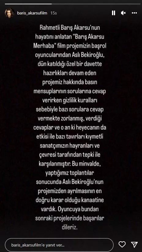 Aslı Bekiroğlu, gelen tepkilerin ardından Instagram hesabından açıklama yaptı. Ünlü oyuncu, özür dileyerek filmden ayrıldığını duyurdu.