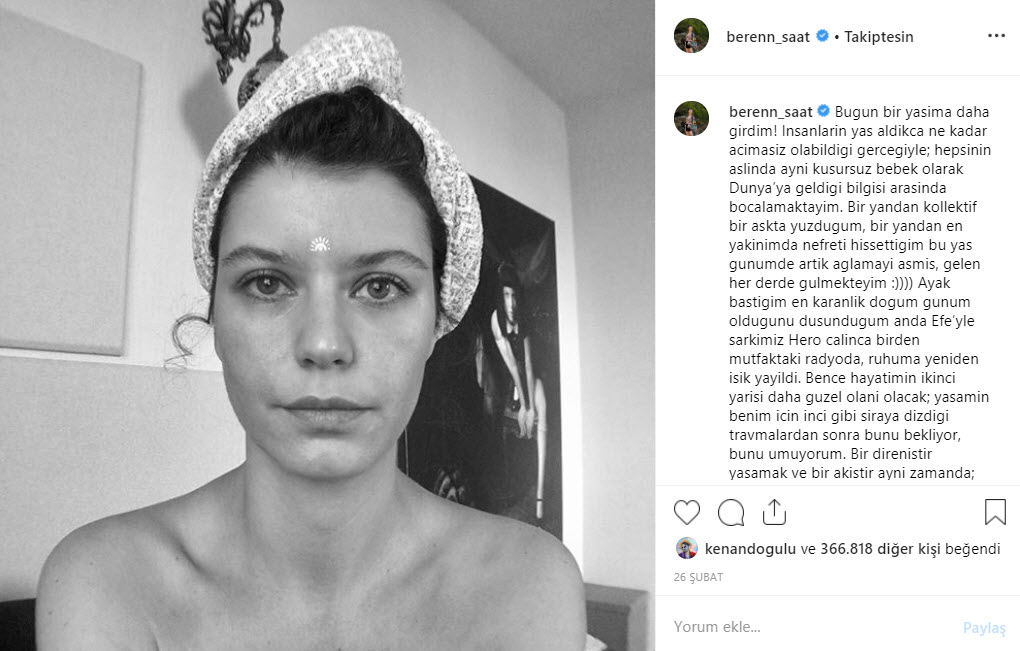 Instagram sayfasında siyah beyaz makyajsız bir fotoğrafını paylaşan Beren Saat, altına şu notu düşmüştü: