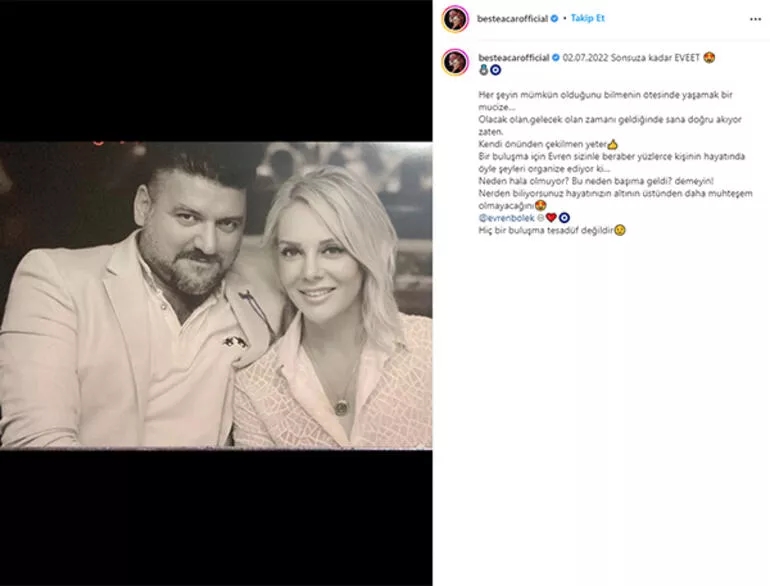 Beste Açar, gündem olan açıklamasından yaklaşık iki ay sonra 'yeni aşk' haberiyle adından söz ettirmişti. Şarkıcı, bir süredir birlikte olduğu Evren Bölek ile fotoğrafını sosyal medya hesaplarından paylaşarak, aşkını duyurmuştu.