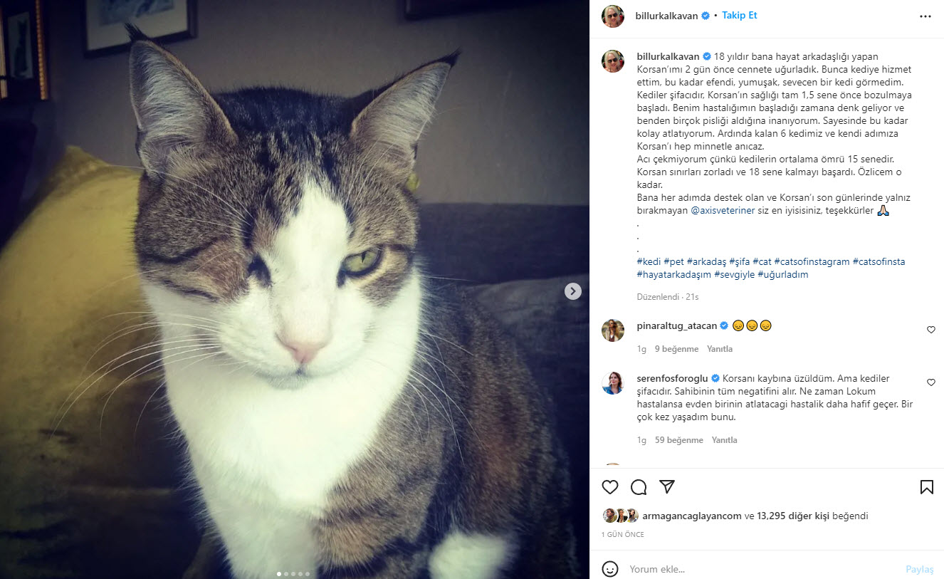 "Sayesinde bu kadar kolay atlatıyorum. Ardında kalan 6 kedimiz ve kendi adımıza 'Korsan'ı hep minnetle anacağız. Acı çekmiyorum çünkü kedilerin ortalama ömrü 15 senedir. 'Korsan' sınırları zorladı ve 18 sene kalmayı başardı. Özleyeceğim, o kadar…" sözlerini dile getirdi.