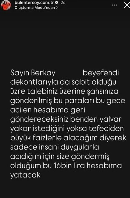 Servetiyle adından söz ettiren Bülent Ersoy, bu kez bambaşka bir konuyla dikkat çekti. Usta sanatçı, Berkay Tuncer adlı kişiye verdiği 16 bin TL'lik borcu sosyal medya hesabından paylaşıp geri istedi.