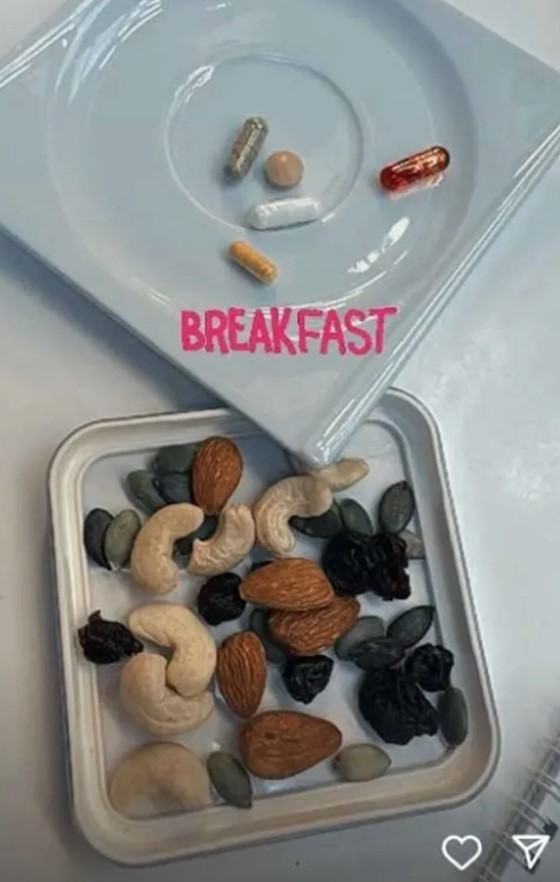 Sosyal medya hesabında zaman zaman yediklerine ve yaptığı egzersizlere yer veren Şıkel, "kahvaltı" notuyla paylaşım yaptı. Şıkel'in paylaştığı kahvaltı tabağı, kuruyemişlerden ve ilaçlardan oluşuyor.