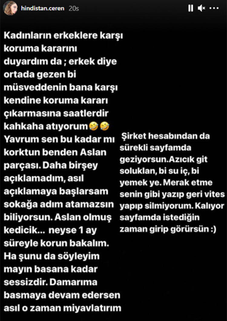 Ceren Hindistan, Aile Mahkemesi'ne başvurarak kendisi hakkında bir ay süreyle koruma kararı ve konuşmama yasağı aldıran Ümit Aslan'a tepki gösterdi.